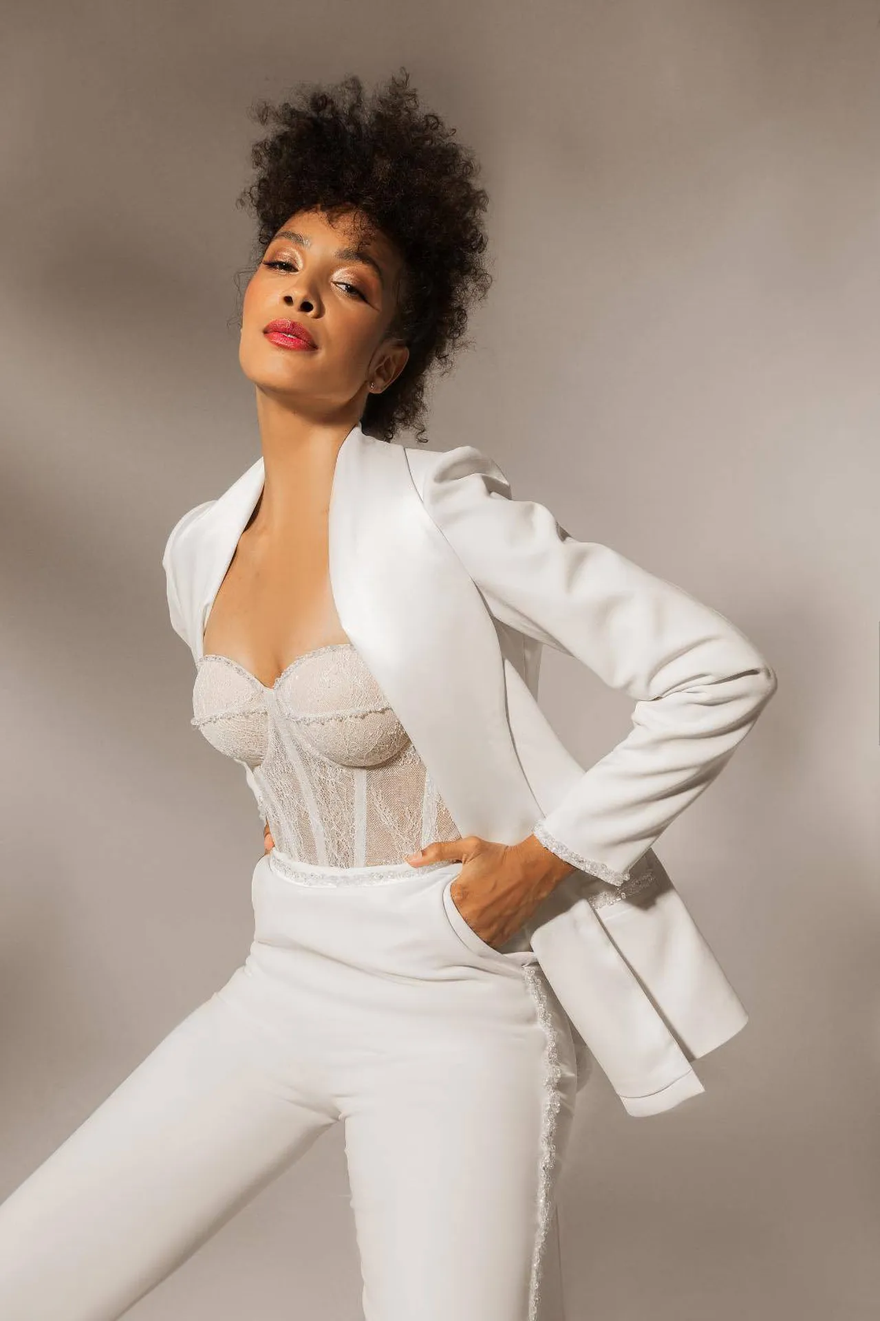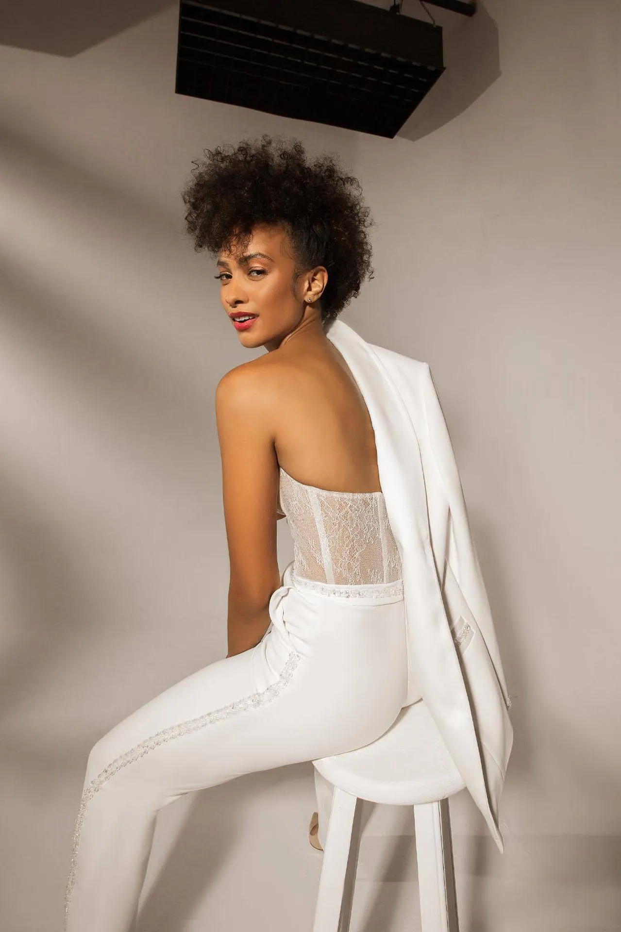 Pour compléter cette création unique, la veste blanche est brodée de petites perles sur les poches, en bas des manches et autour des boutons, créant ainsi une finition délicate et élégante. Ce détail sophistiqué donne à la tenue une dimension supplémentaire, parfaite pour un mariage civil moderne tout en restant élégante.