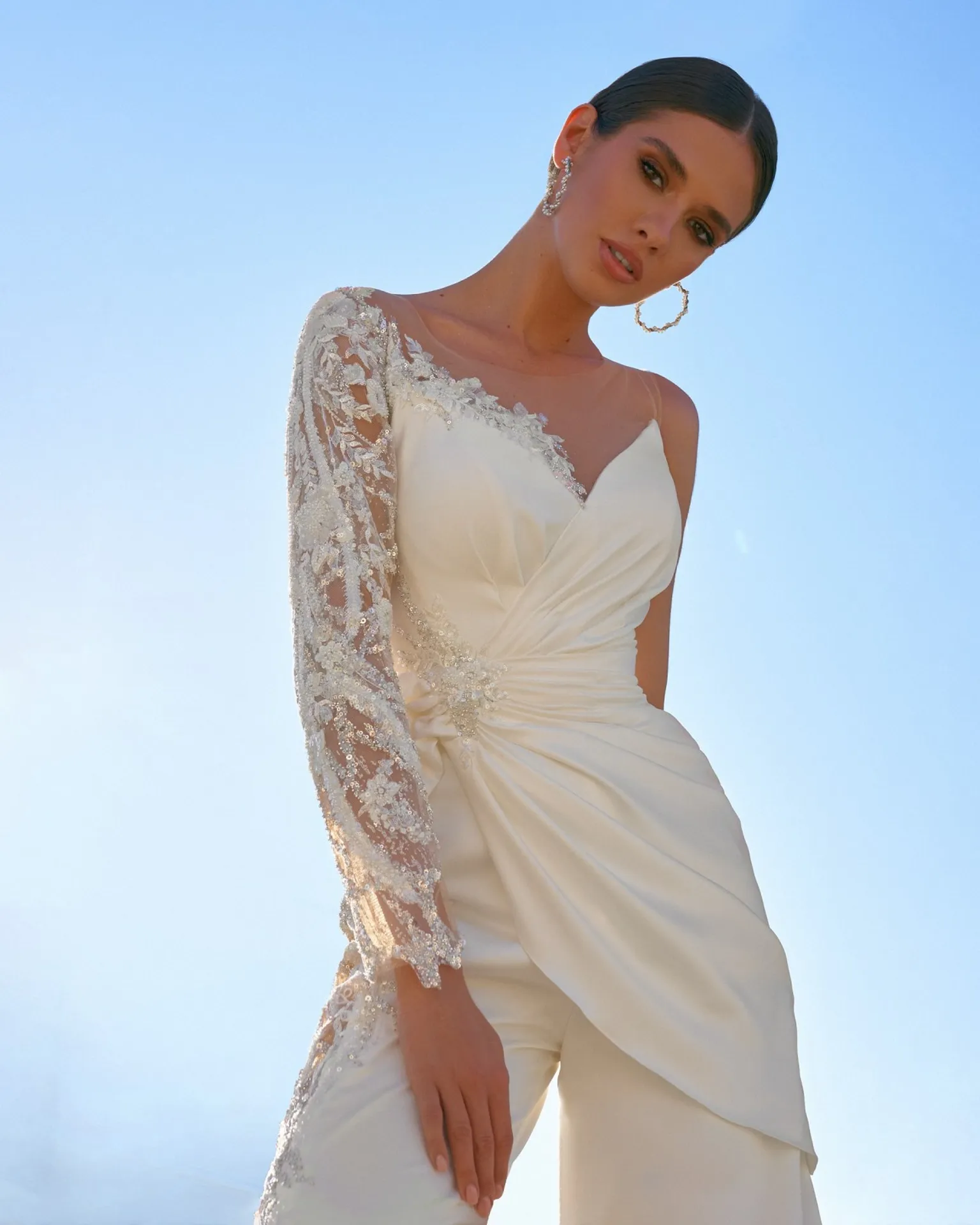 Idéale pour un mariage chic ou bohème, cette combinaison de mariée est le choix parfait pour une mariée moderne et élégante.