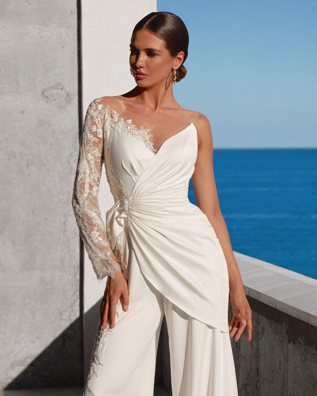 Découvrez la combinaison de mariée VENNA de la créatrice Anna Sposa, un modèle exceptionnel qui incarne l'élégance et la modernité. Spécialement conçu pour la mariée chic et glamour, ce modèle est disponible en exclusivité à la boutique Solution Cérémonie, située à Marseille Vieux Port.