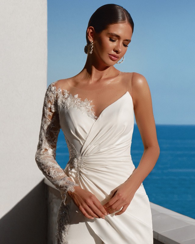Une des caractéristiques marquantes de ce modèle est sa manche unique en dentelle perlée, créant un effet tatouage sur la peau, avec une finition subtile de petits boutons transparents pour un look encore plus délicat. La taille est parfaitement marquée par un bijou raffiné, qui ajoute une touche de glamour tout en soulignant la silhouette.