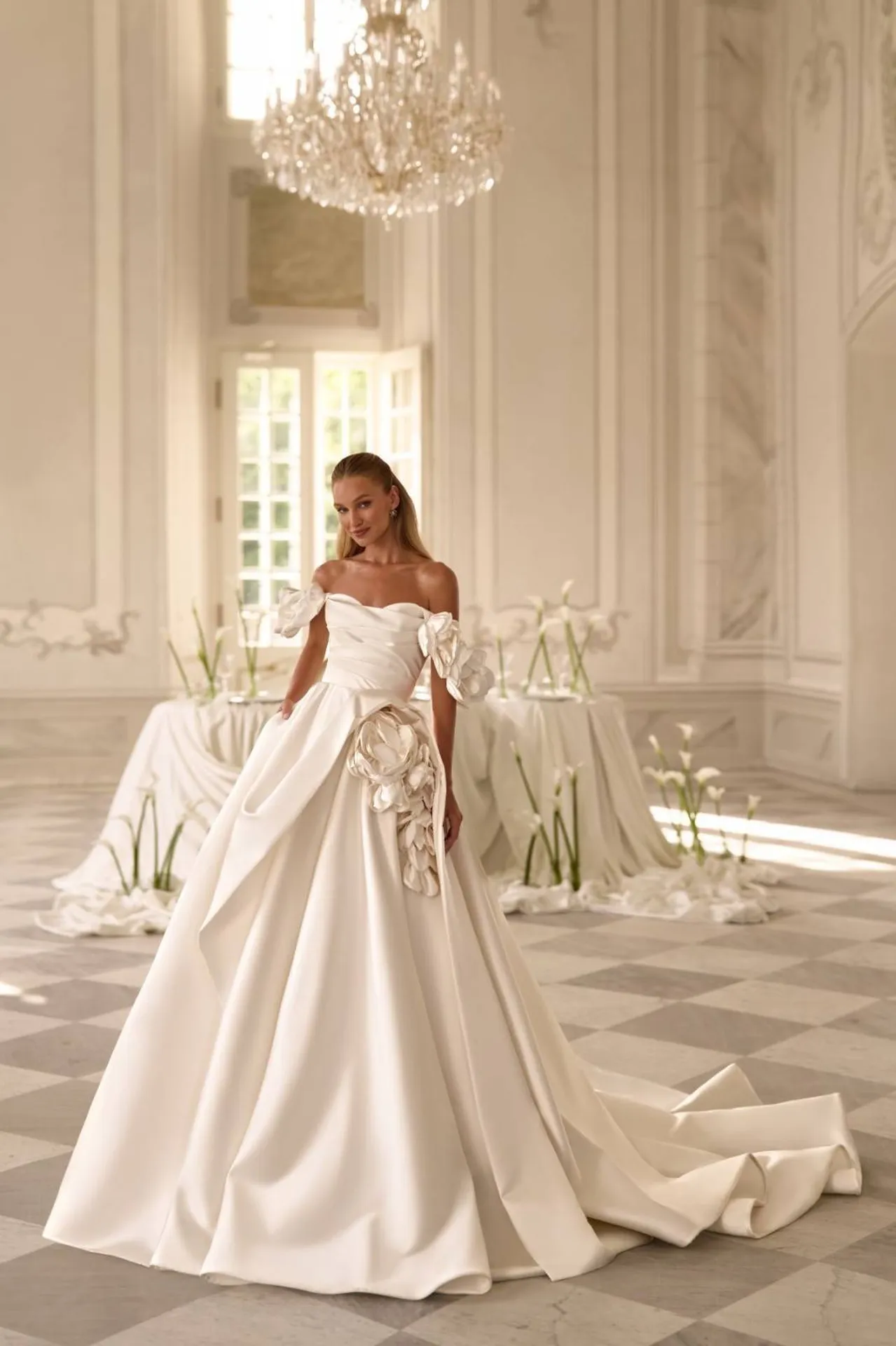 Une robe princesse volumineuse n’est pas lourde, contrairement à l’idée que l’on peut s’en faire. Les tissus actuels permettent d’avoir un volume aérien, presque léger. Le tulle donne de l’ampleur sans peser ; certains satins créent un bel arrondi ; les jupes en couches superposées permettent un mouvement naturel très photogénique.