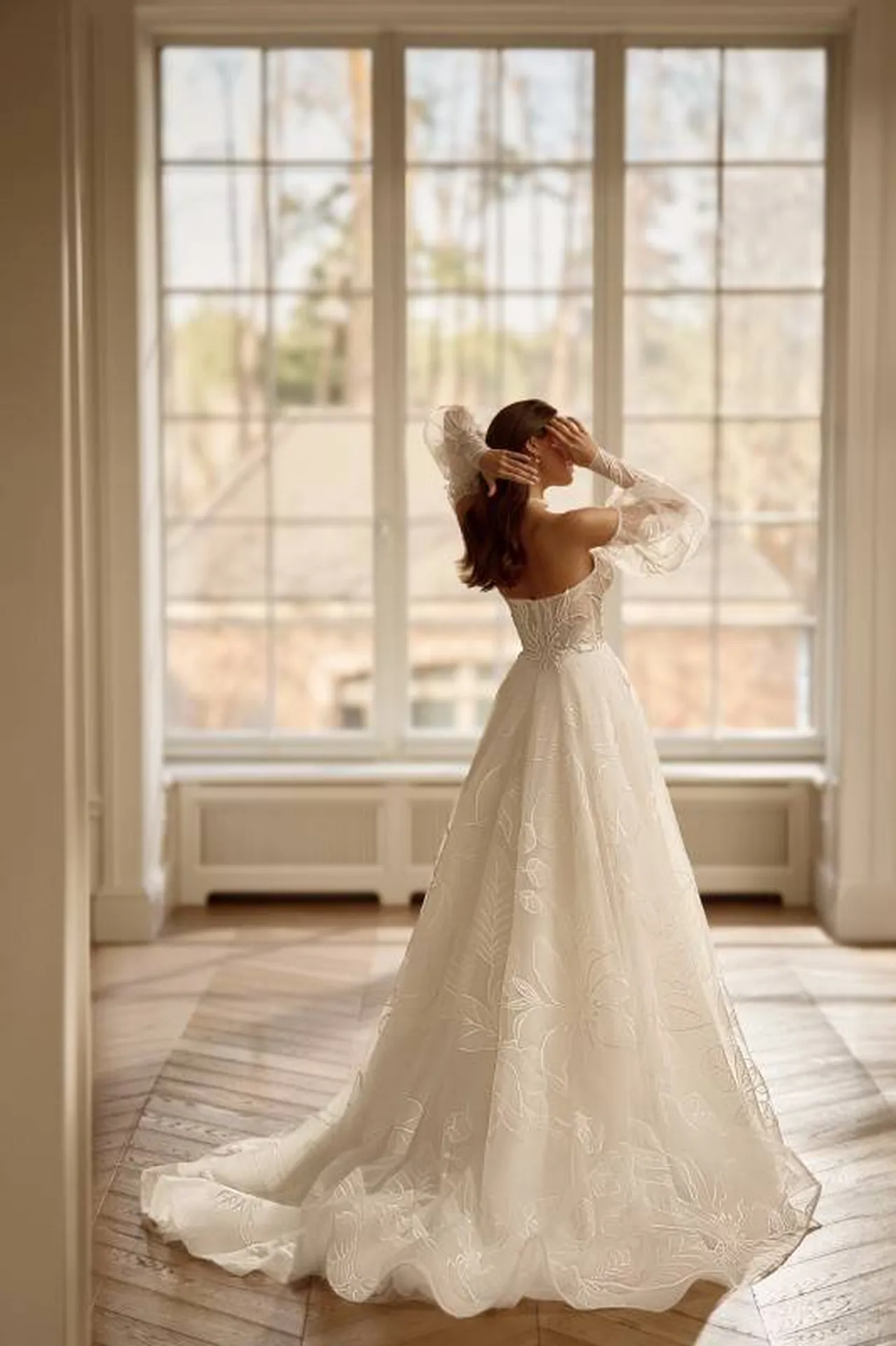 la robe de mariée à marseille , comment ne pas tomber sous le charme de ce modèle décolleté bateau avec cette manche longue raffiné de la maison tarik ediz à marseille