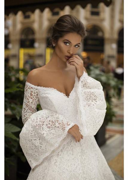robe de mariée à marseille décolleté bateau avec manche longue bouffante à Marseille