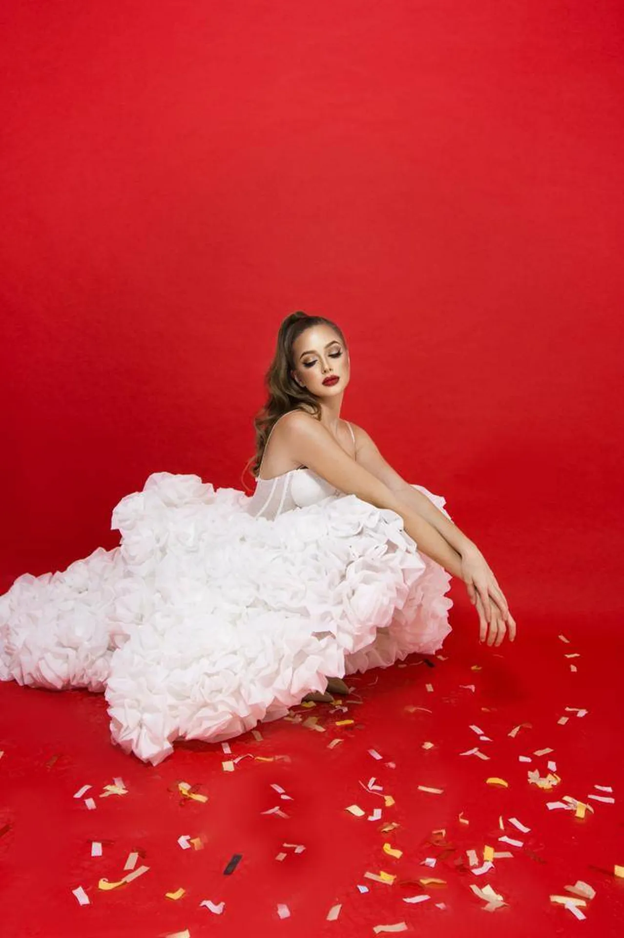 Le bas de la robe, asymétrique et fluide, est court devant et long derrière, créant un effet spectaculaire et élégant. Le volume est sublimé par de délicates fleurs en tissu, ajoutant une touche couture et romantique.