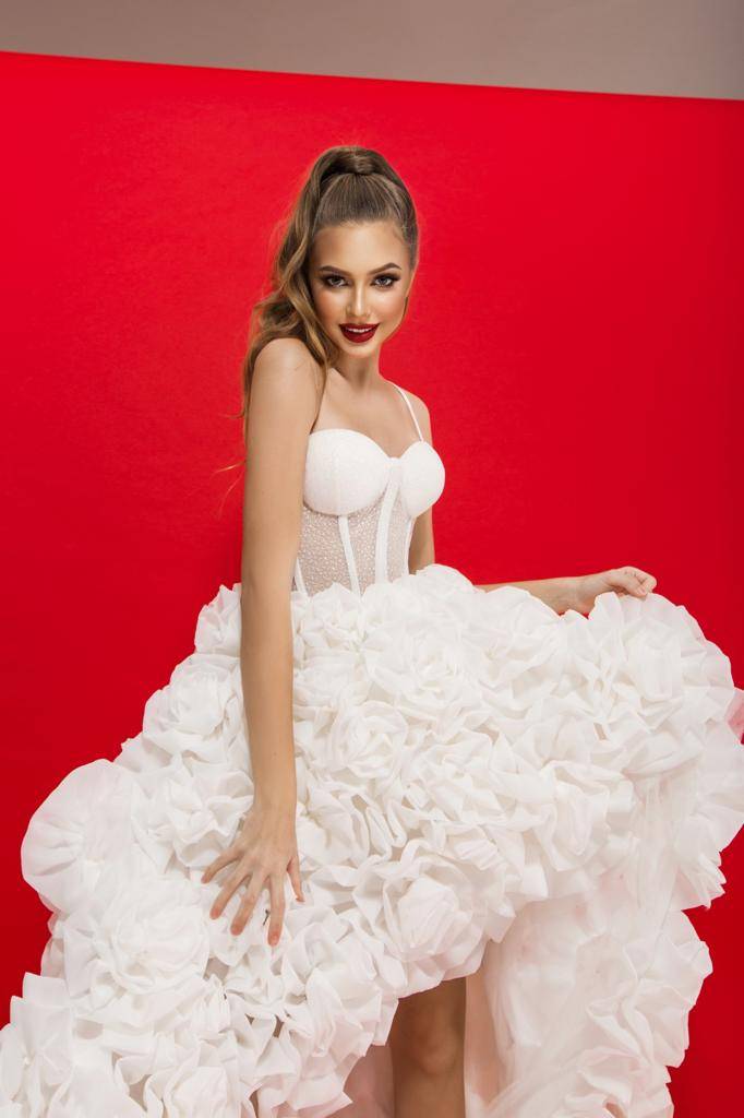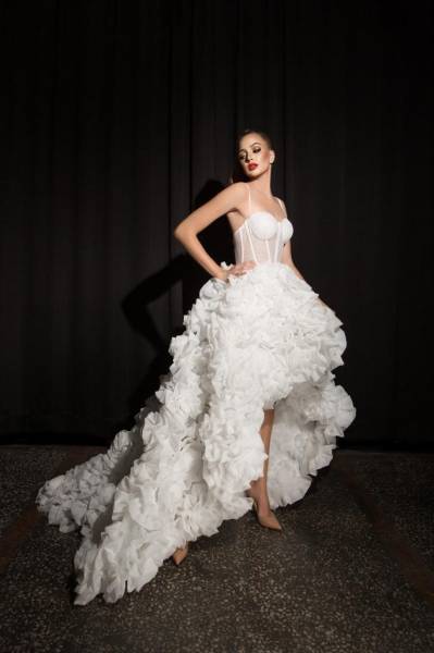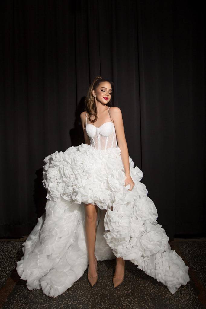 Le bas de la robe, asymétrique et fluide, est court devant et long derrière, créant un effet spectaculaire et élégant. Le volume est sublimé par de délicates fleurs en tissu, ajoutant une touche couture et romantique.