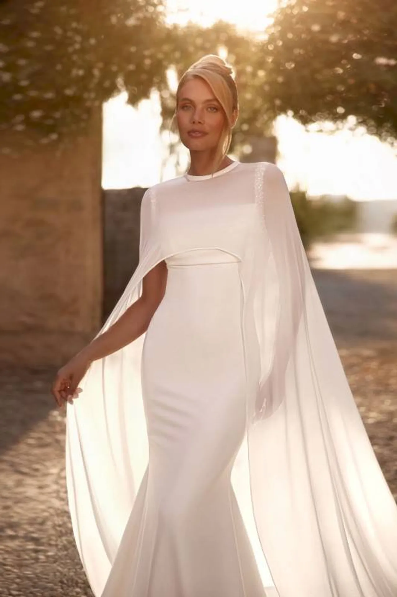 Contrairement au voile traditionnel, la cape modernise la tenue et offre une allure royale et contemporaine. Elle sublime l’entrée dans l’allée et magnifie les photos grâce à son effet aérien. Amovible comme le modèle Coco en satin stretch ou intégrée à la robe, elle permet de transformer la silhouette entre la cérémonie et la réception.