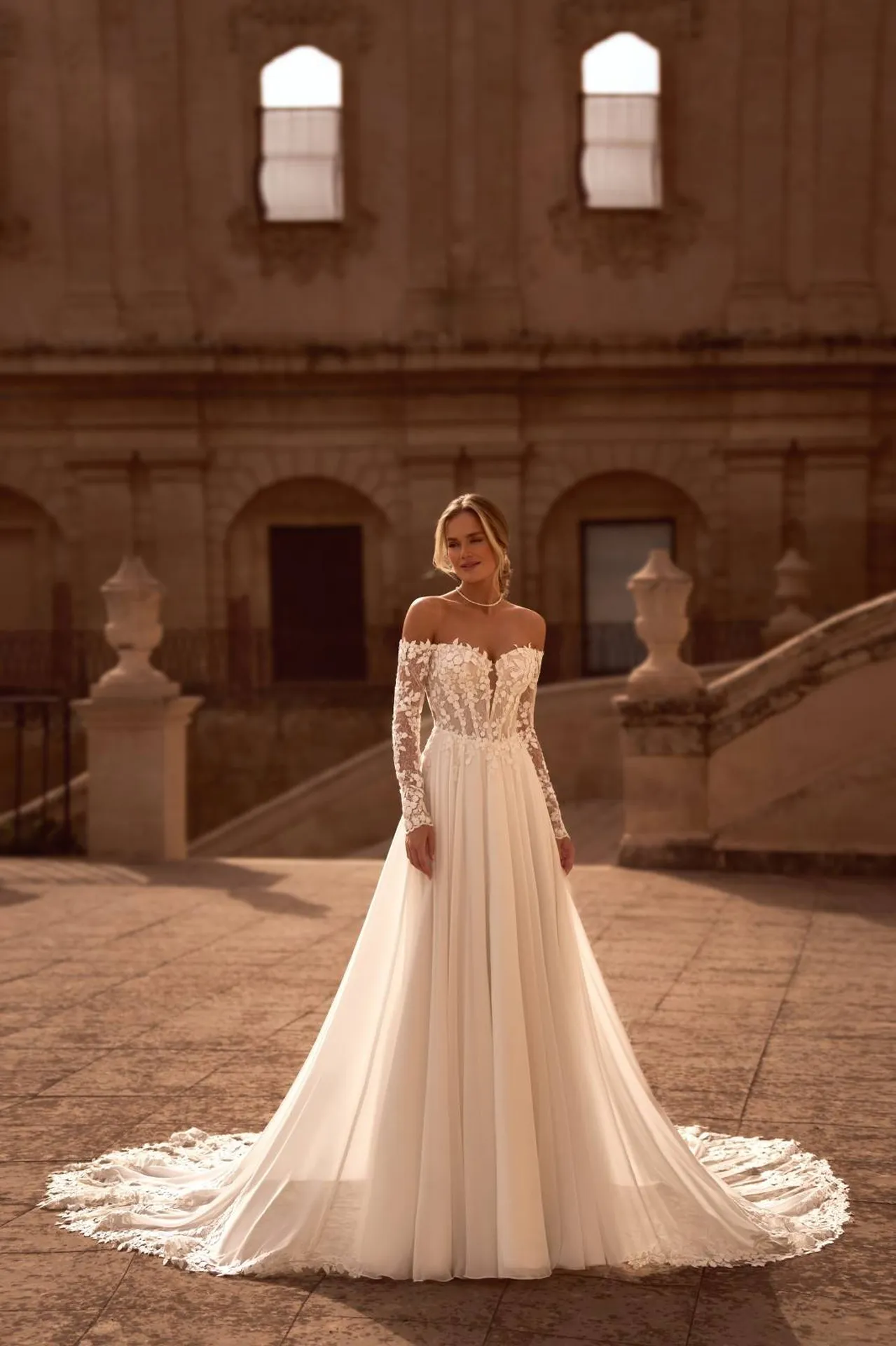 Robe de mariée bohème avec une longue traîne de tulle et manches longues brodées de dentelles