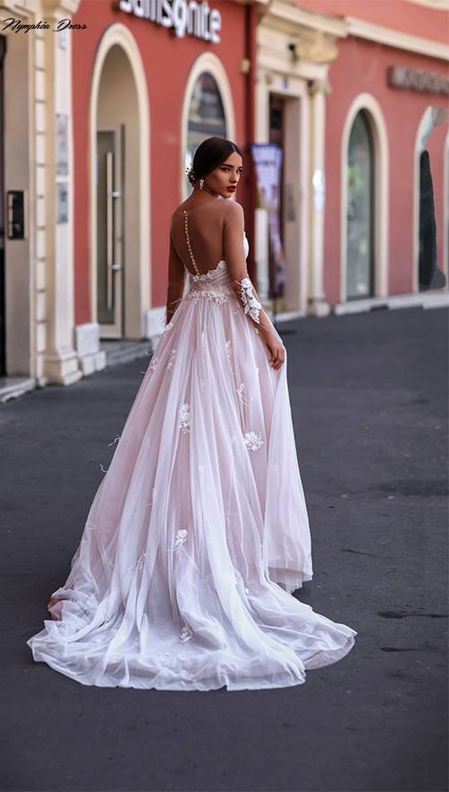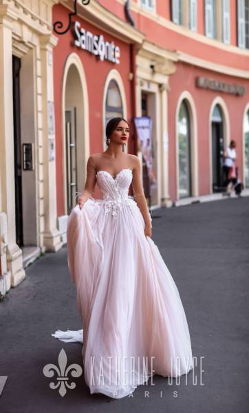 le bas de la robe de mariée katalina , est composé de plusieurs épaisseurs de tulles dans deux coloris différents .