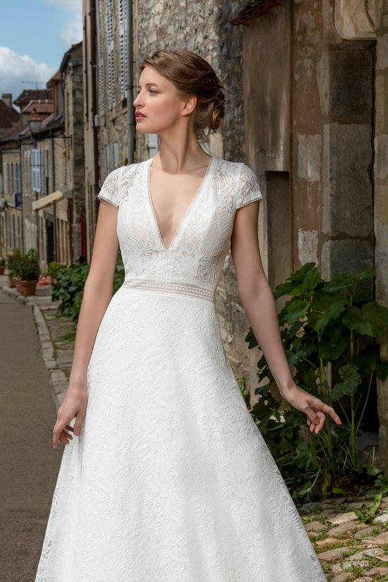 Robe de mariée Aleksyya bohème fluide décolleté en V manches courtes en dentelle collection 2023 à Marseille