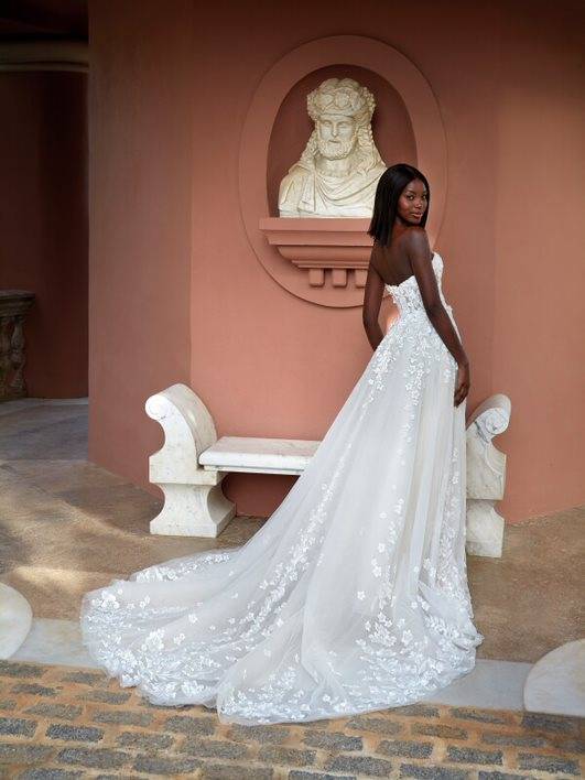 La jupe de la robe est cintrée par une couronne de motifs de fleurs dispose d'une courte traine rebrodées de la même dentelle que celle du bustier.