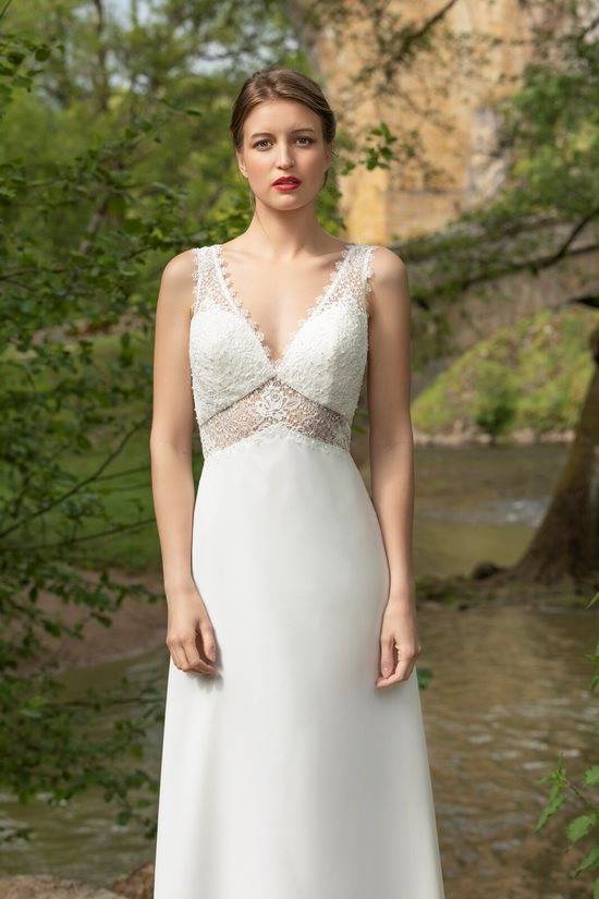 La robe de mariée Bm2222 est une robe de mariée bohême avec des bretelles en fine dentelle plumetis et un décolleté plongeant en V bordé de galons de dentelle perlée