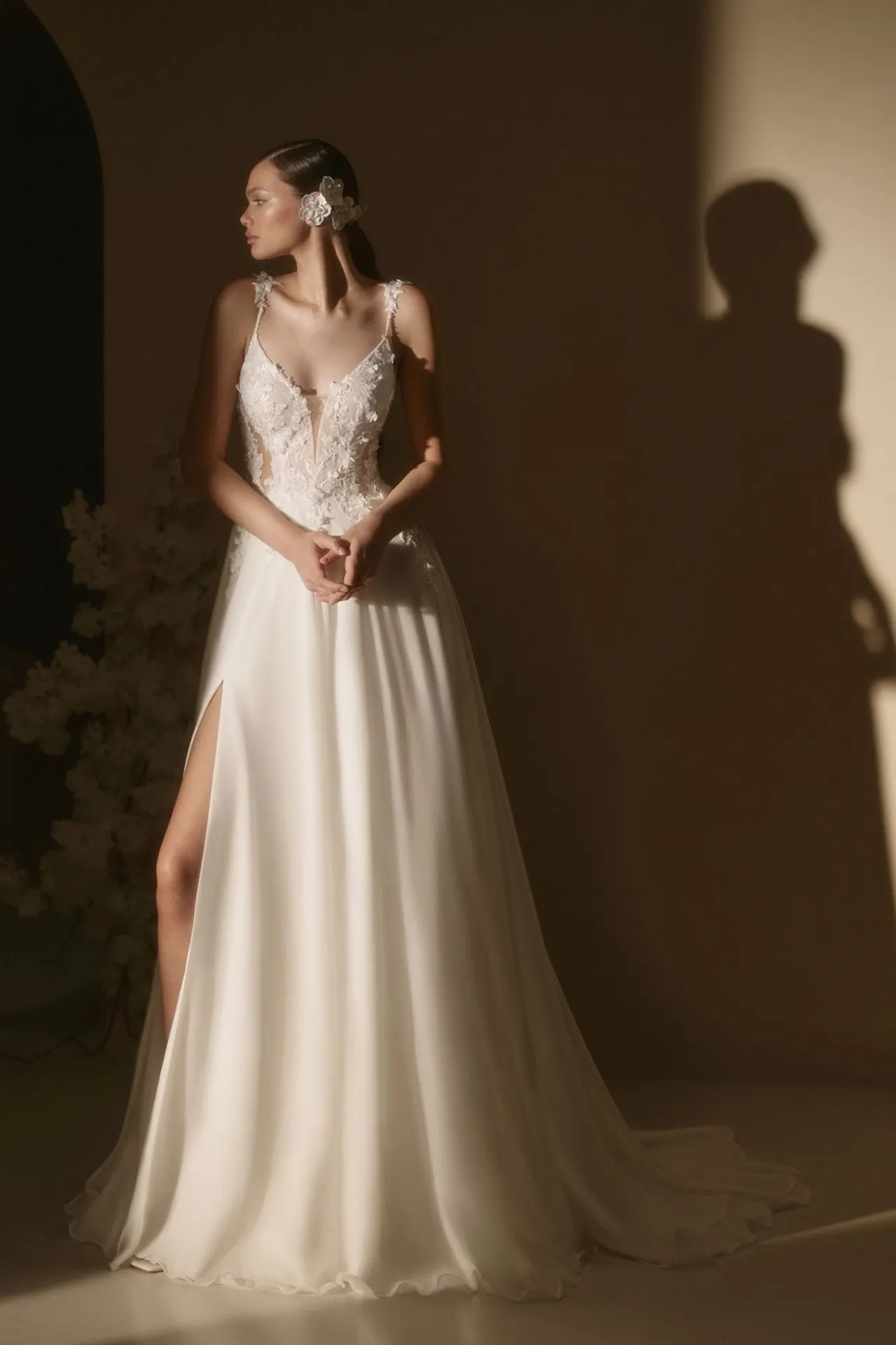 Réalisée dans des matières nobles, la robe Azorina se distingue par son style bohème chic et glamour. Son bustier décolleté en V, orné de dentelle florale 3D, incarne parfaitement la tendance des robes de mariée 2025. Les bretelles fines garnies de petites fleurs en 3D ajoutent une touche romantique et délicate, tandis que les côtés transparents apportent une pointe de sensualité discrète.