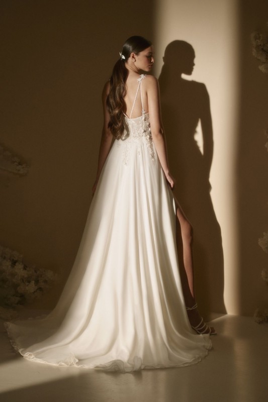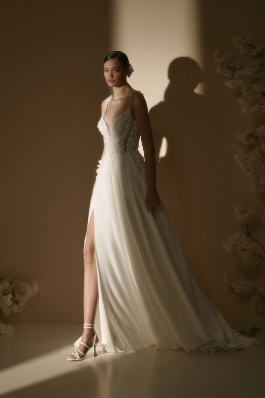 Réalisée dans des matières nobles, la robe Azorina se distingue par son style bohème chic et glamour. Son bustier décolleté en V, orné de dentelle florale 3D, incarne parfaitement la tendance des robes de mariée 2025. Les bretelles fines garnies de petites fleurs en 3D ajoutent une touche romantique et délicate, tandis que les côtés transparents apportent une pointe de sensualité discrète.