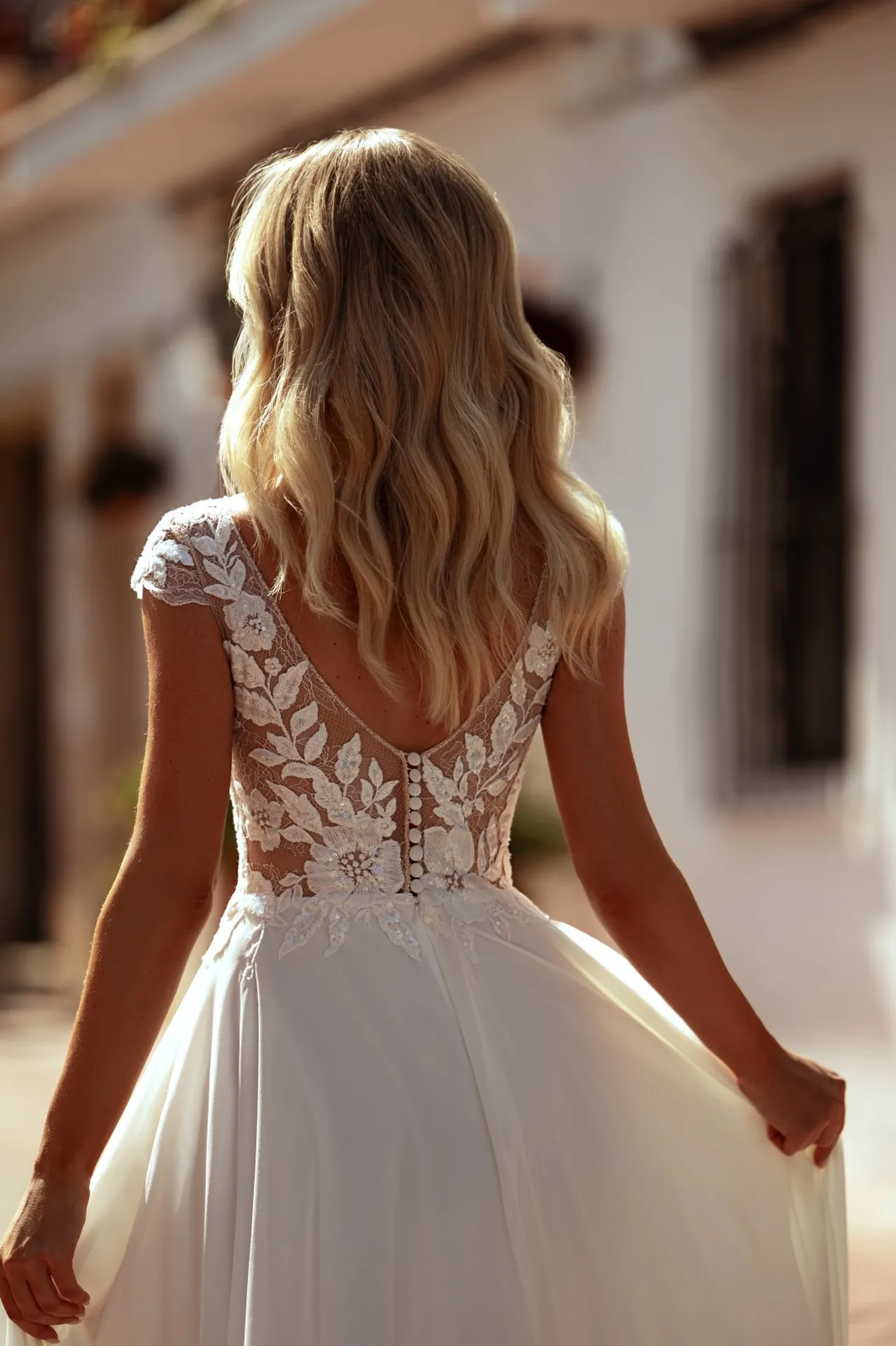 Le dos de la robe Syuli, en V également, est orné d’une rangée de petits boutons blancs qui apportent une finition couture et sophistiquée. Ce détail raffiné confère une allure intemporelle et romantique à la robe, parfaite pour une mariée qui souhaite briller tout en restant élégante.