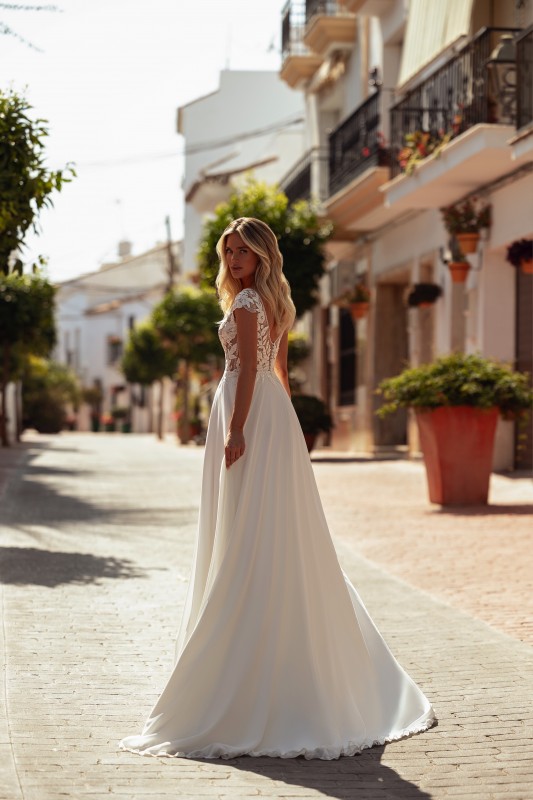 Le dos de la robe Syuli, en V également, est orné d’une rangée de petits boutons blancs qui apportent une finition couture et sophistiquée. Ce détail raffiné confère une allure intemporelle et romantique à la robe, parfaite pour une mariée qui souhaite briller tout en restant élégante.