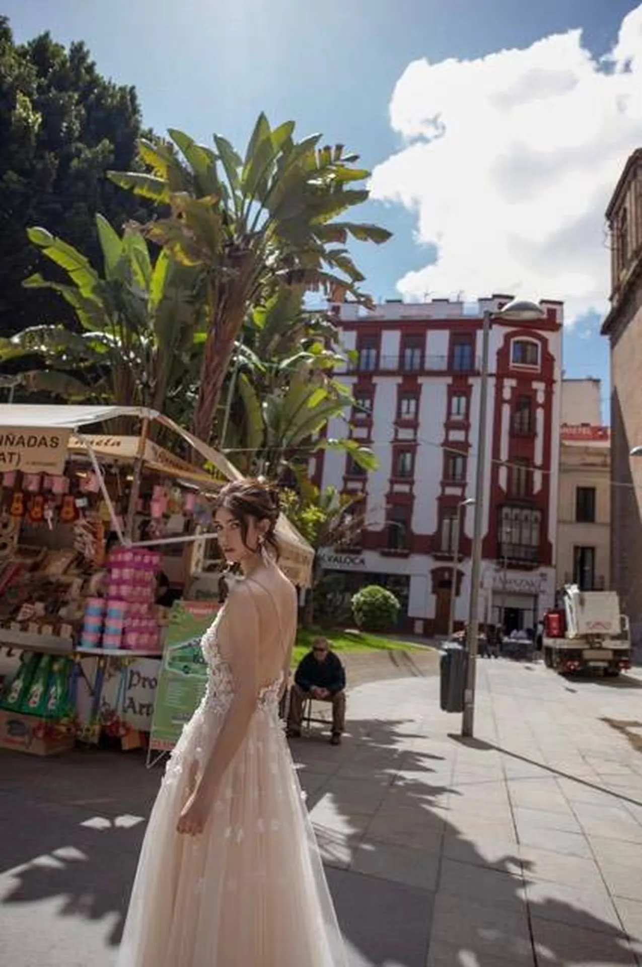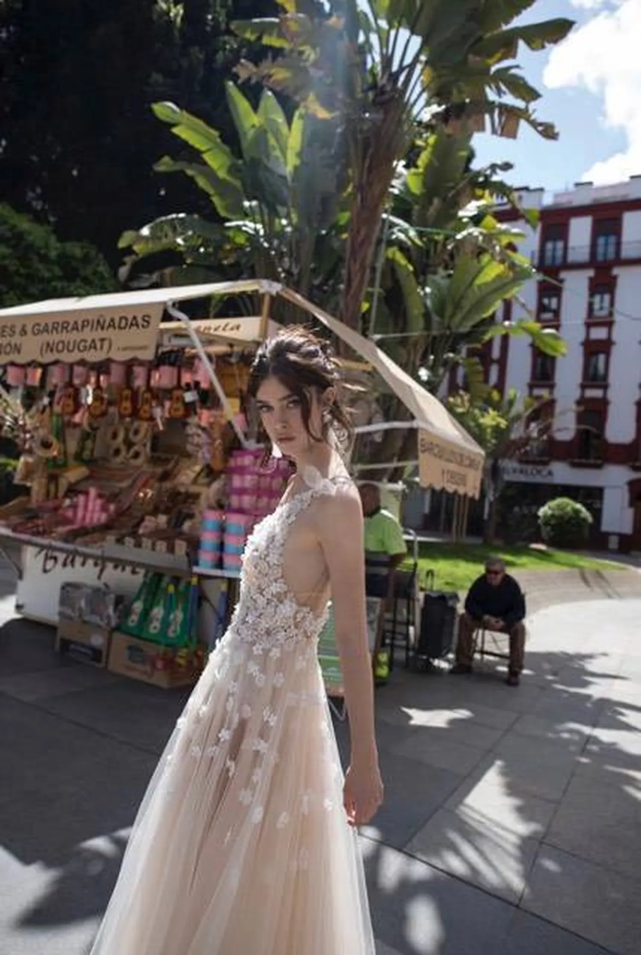 La jupe fluide en tulle nude est également brodée de fleurs blanches, reprenant le motif du décolleté. Cette jupe descend en toute légèreté, avec une fluidité qui permet à la mariée de se mouvoir avec grâce. Ce modèle est parfait pour une cérémonie bohème, qu'elle se déroule en extérieur ou dans un cadre intime.