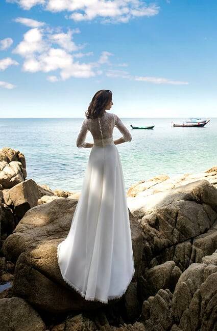 Robe de mariée bohème fluide en mousseline décolleté en V rebrodé de dentelles , avec manches longues 3/4 effet tatouage de dentelle , le dos de la robe de mariée est recouvert de la même manière avec un jeu de transparence et fermé avec des petits boutons de soie