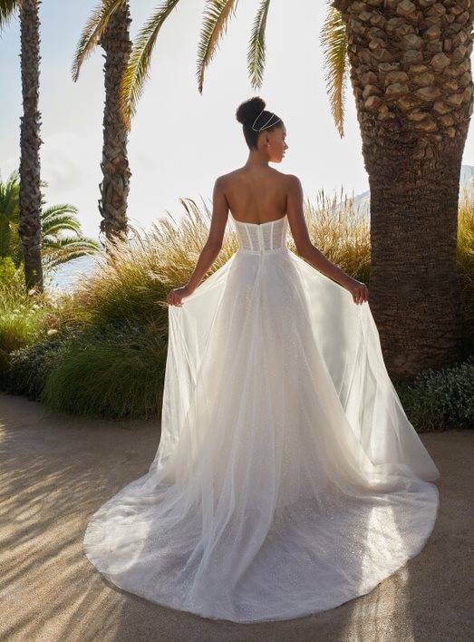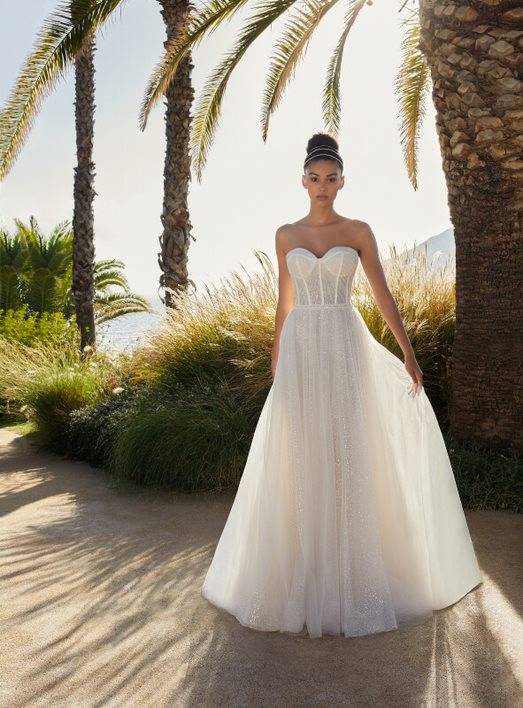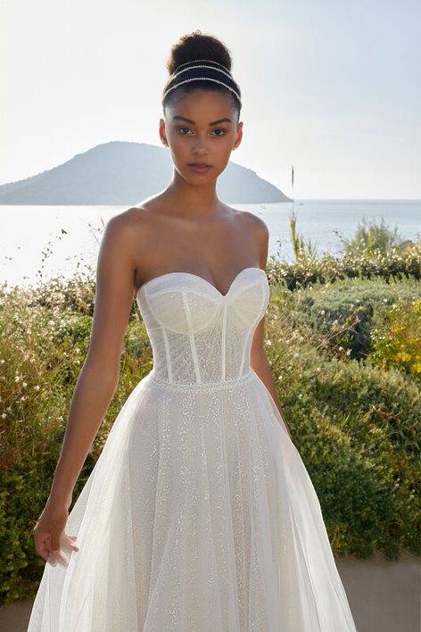 Robe de mariée bohême forme trapèze avec bustier baleiné scintillant cosmobella 2023 Marseille .