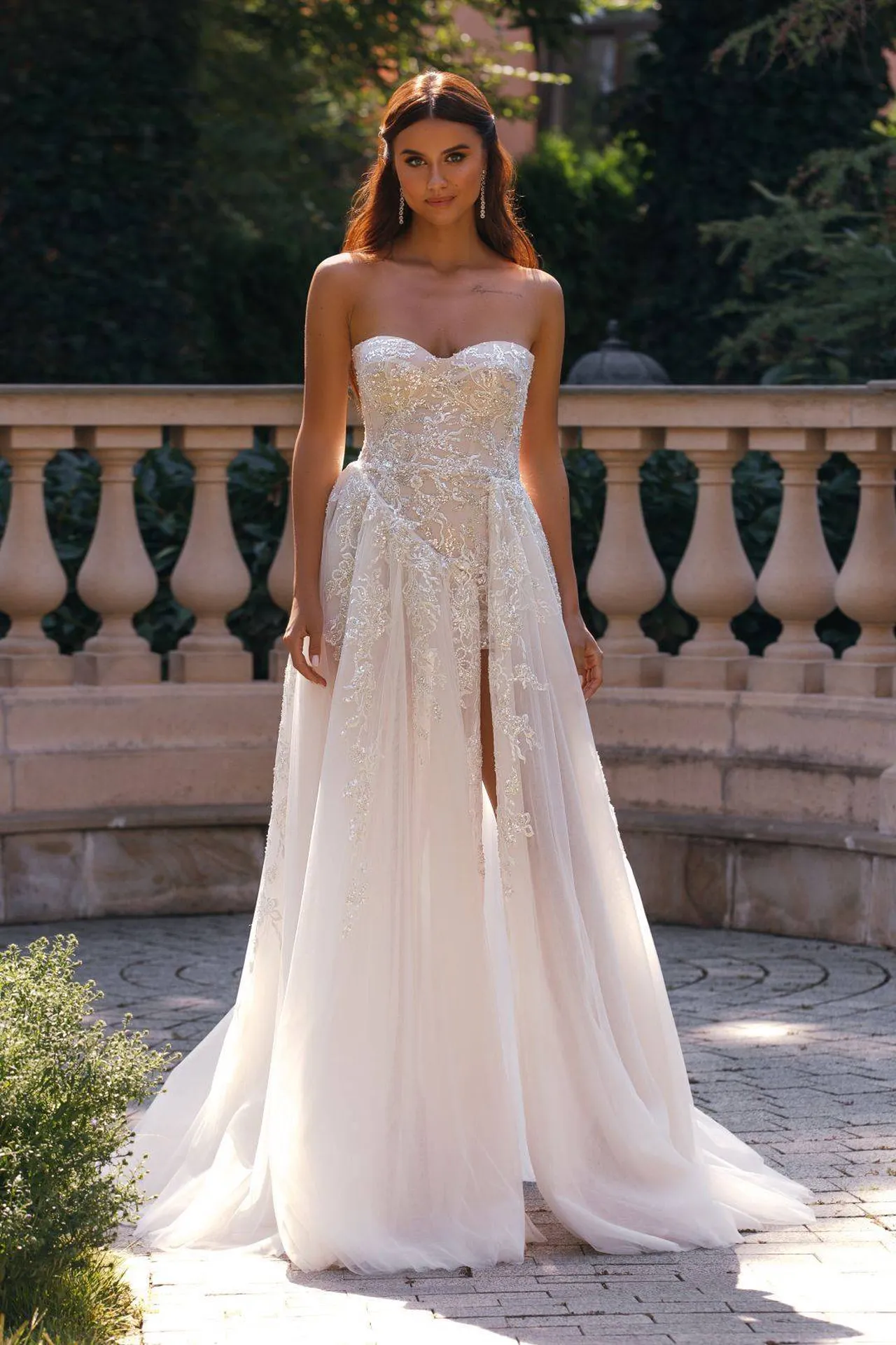 La deuxième partie de la robe consiste en une traîne amovible, composée de plusieurs épaisseurs de tulle léger. Cette traîne est décorée de bordures de dentelle perlée, apportant une touche couture qui fait toute la différence. Vous pouvez ainsi transformer votre look pour la cérémonie religieuse ou la soirée de mariage, en ajoutant une dimension majestueuse tout en conservant un style moderne.