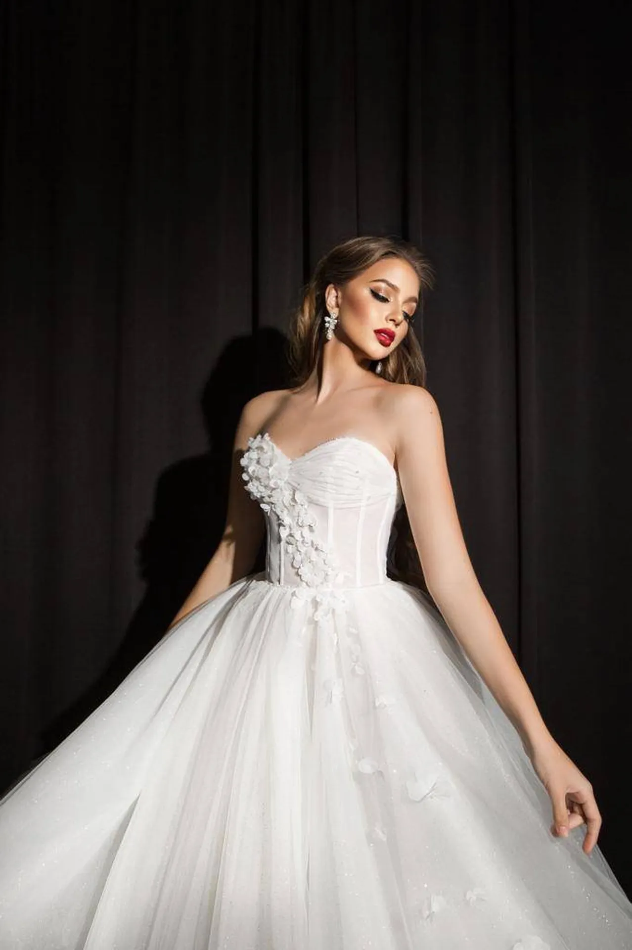 Cette robe de mariée bustier est une véritable œuvre d’art. Son bustier en style lingerie, brodé d’une cascade de fleurs en 3D, met en valeur le buste avec élégance. Les baleines apparentes ajoutent une touche couture, parfaite pour les mariées en quête de sophistication.