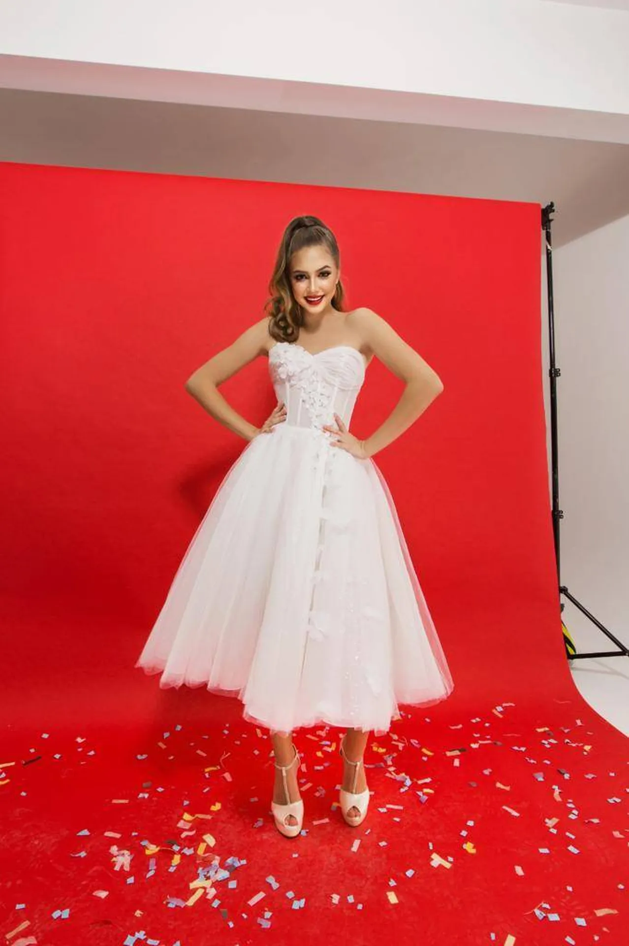 La jupe évasée de cette robe se distingue par sa légère paillette, offrant un subtil éclat à chaque mouvement. Les fleurs en organza, identiques à celles du bustier, ornent le bas de la robe pour un effet fluide et aérien qui captivera tous les regards.