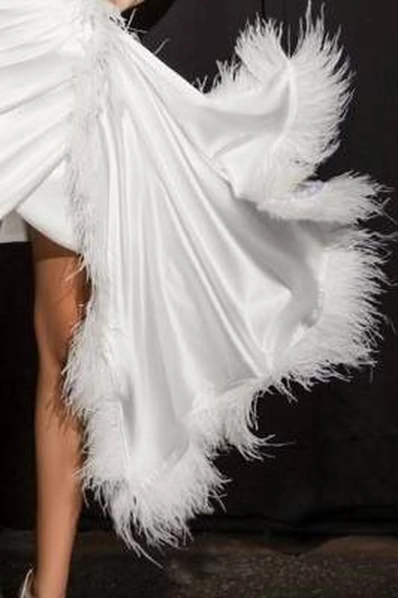 - Un volant bordé de plumes d’autruche : Ce détail couture apporte du volume et une allure chic et moderne.