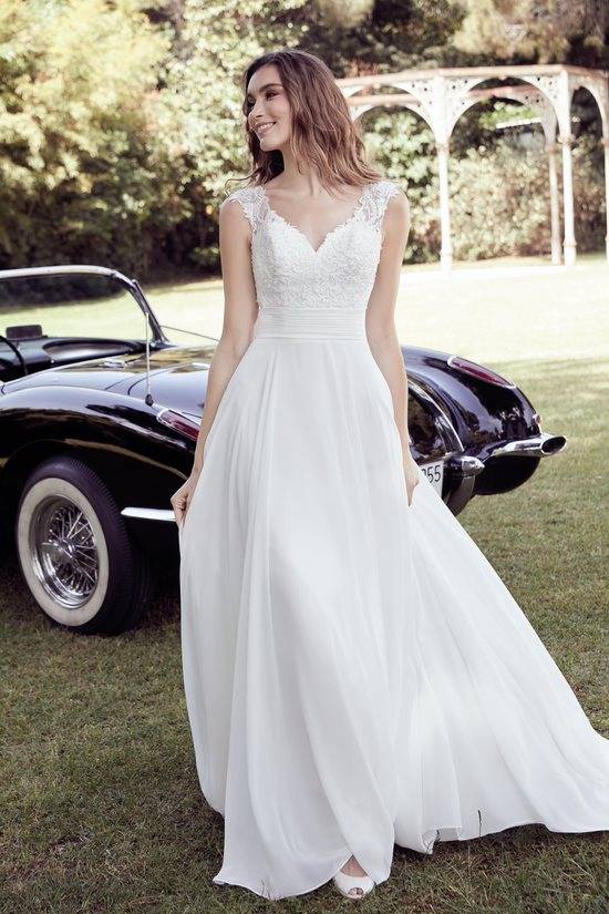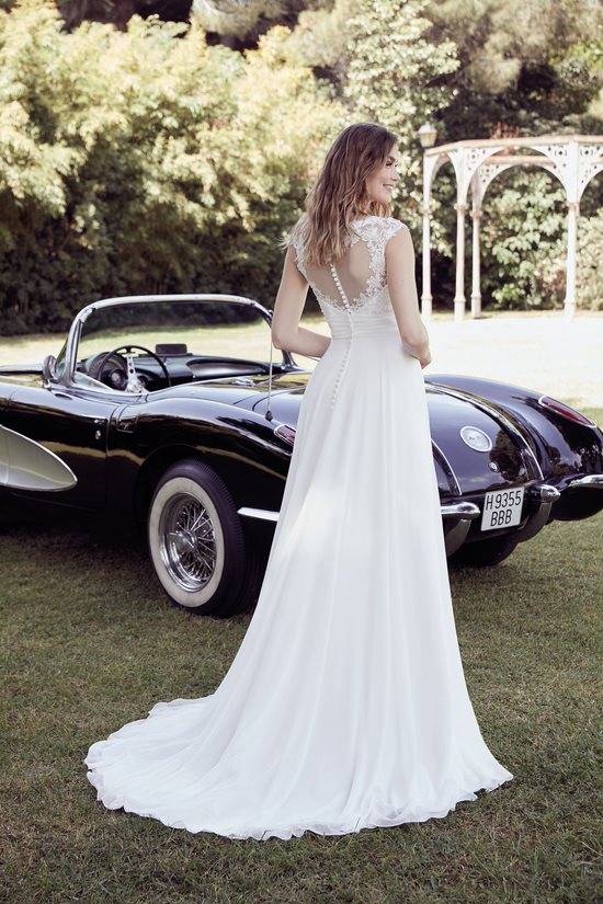 La robe de mariée bohème 22518 est une robe de mariée fluide en mousseline avec une un jolie petite traine