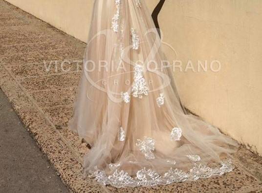 Le dessus de la jupe de la robe de mariée est en tulle de couleur ivoire orné de dentelle avec des motifs de fleurs , avec une longue traîne