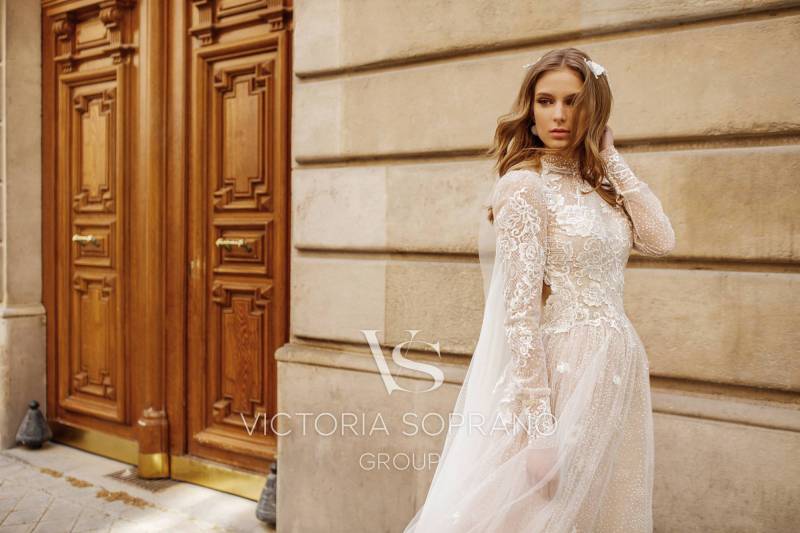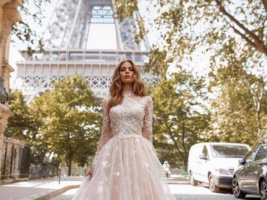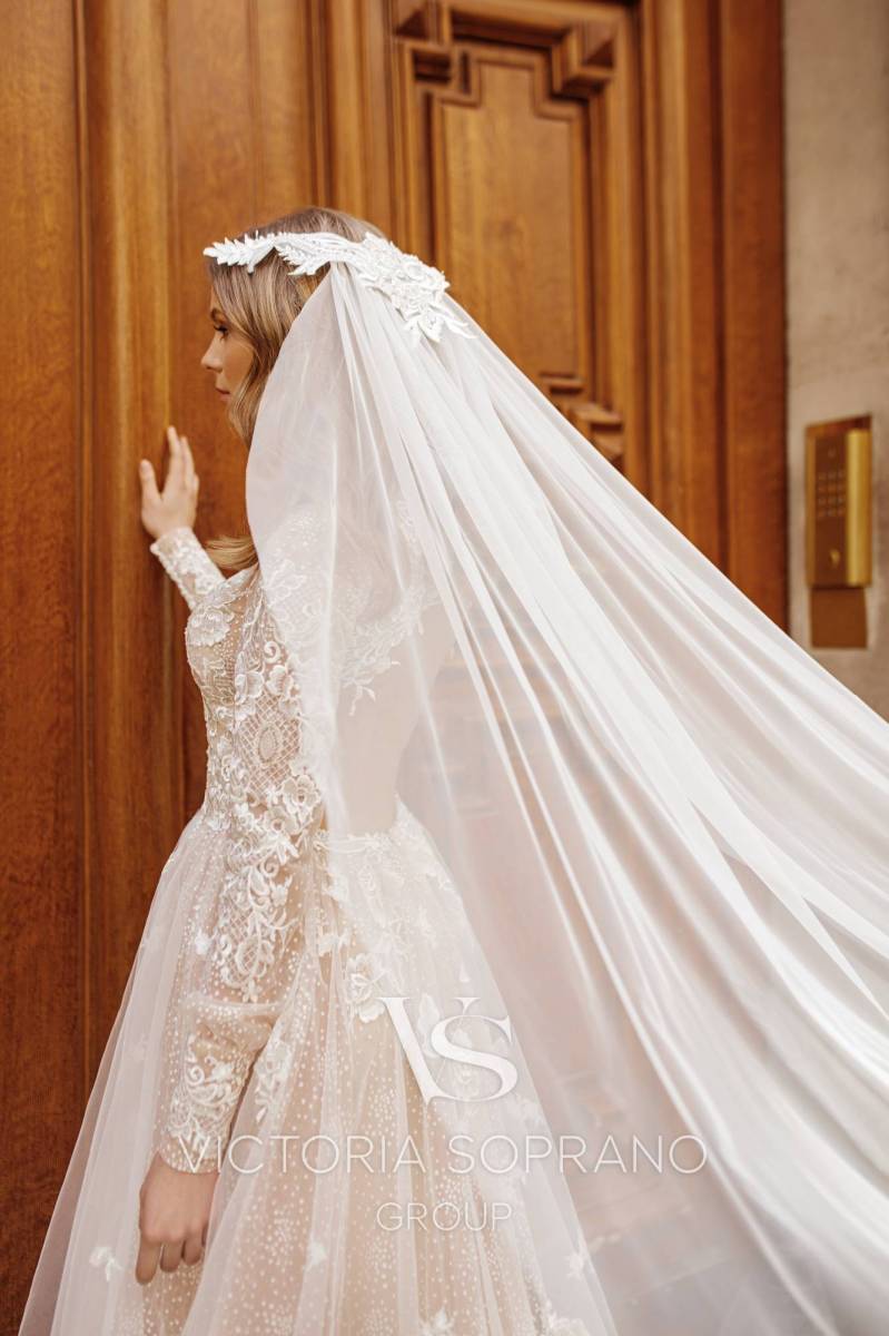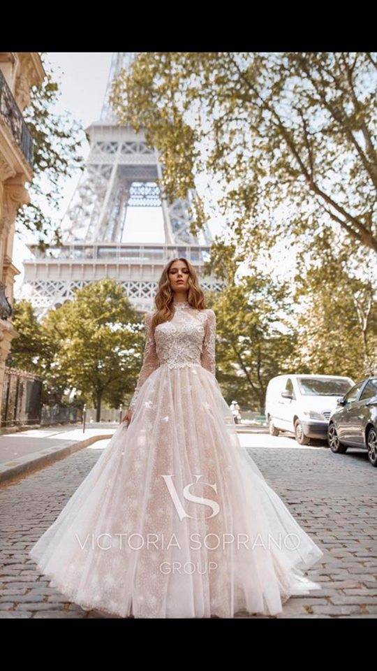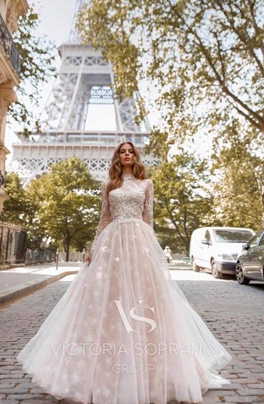 robe de mariée Entièrement brodée de dentelle et tulle , un modèle de Robe de mariée avec manches longues et ras le cou