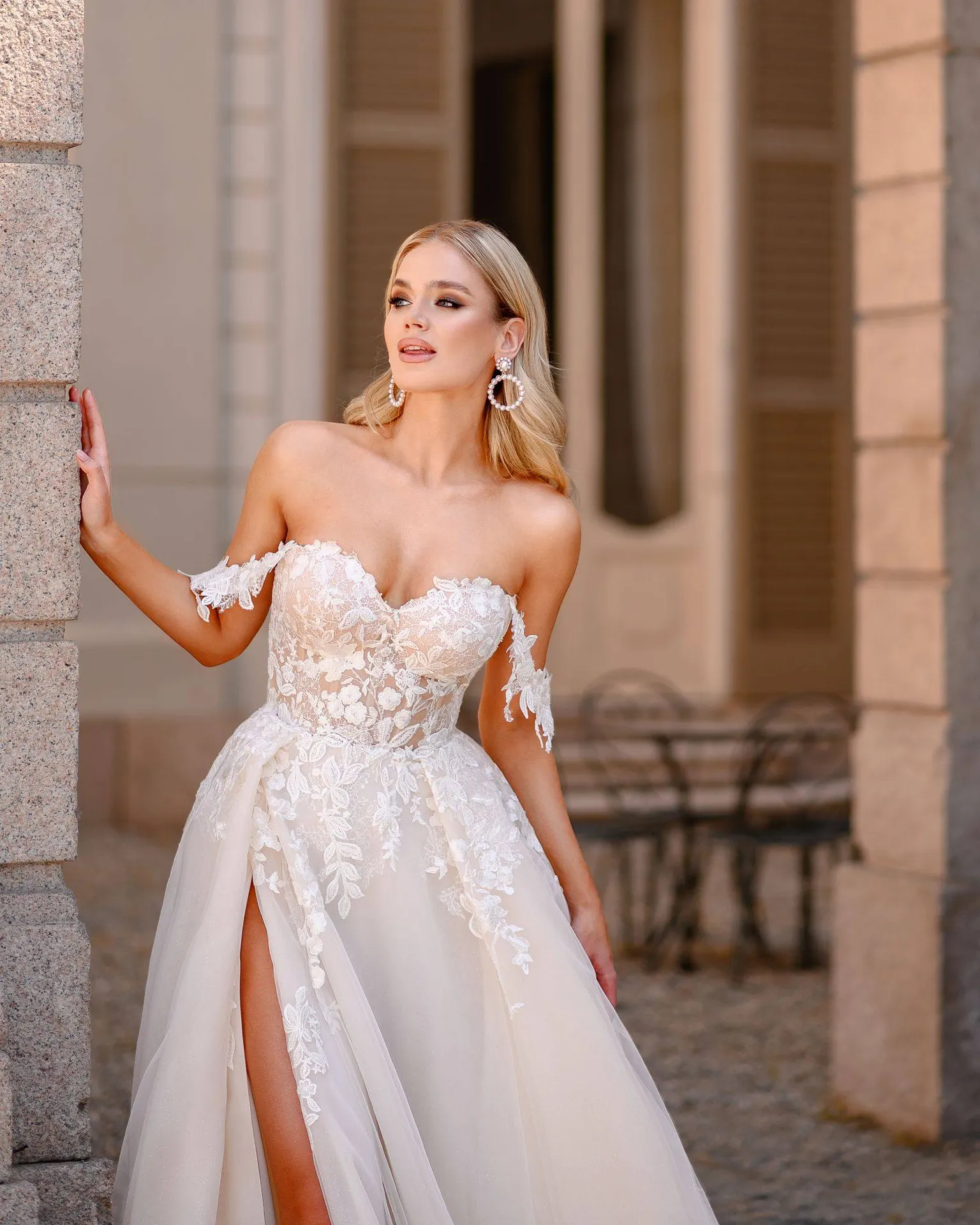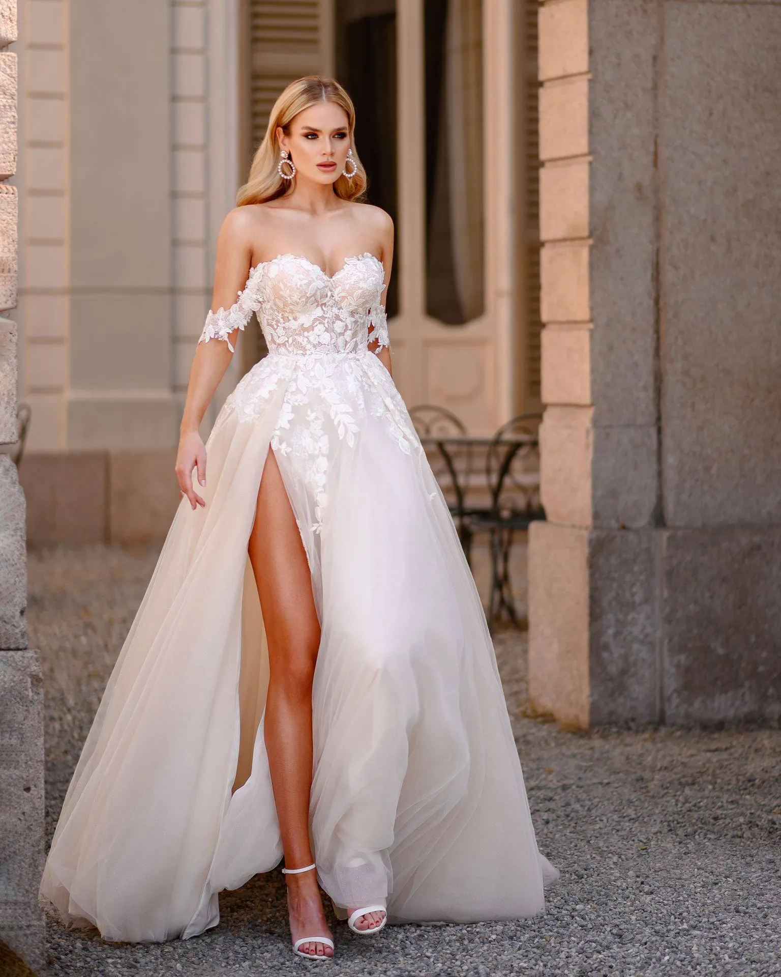 Le haut de la robe Sunita se distingue par un décolleté bateau, une coupe intemporelle qui met en valeur le port de tête et la finesse des épaules. Des applications de dentelle florale, finement travaillées, ornent ce décolleté et descendent gracieusement jusqu’à la taille, ajoutant une touche romantique et sophistiquée.