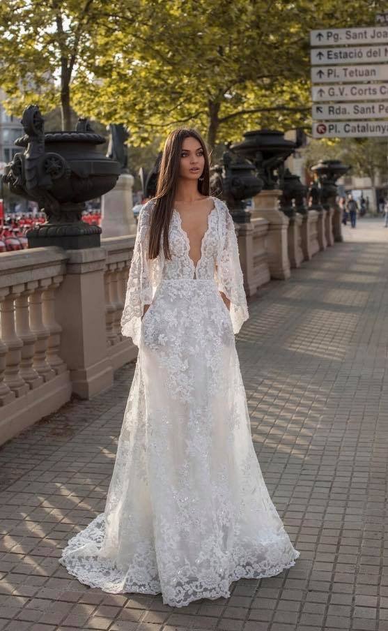robe de mariée en dentelle décolleté plongeant avec une cape brodée d'une dentelle similaire et de fleurs en relief couvrant le bras et le haut des épaules , bas de la robe fluide en dentelle se terminant par une petite traîne