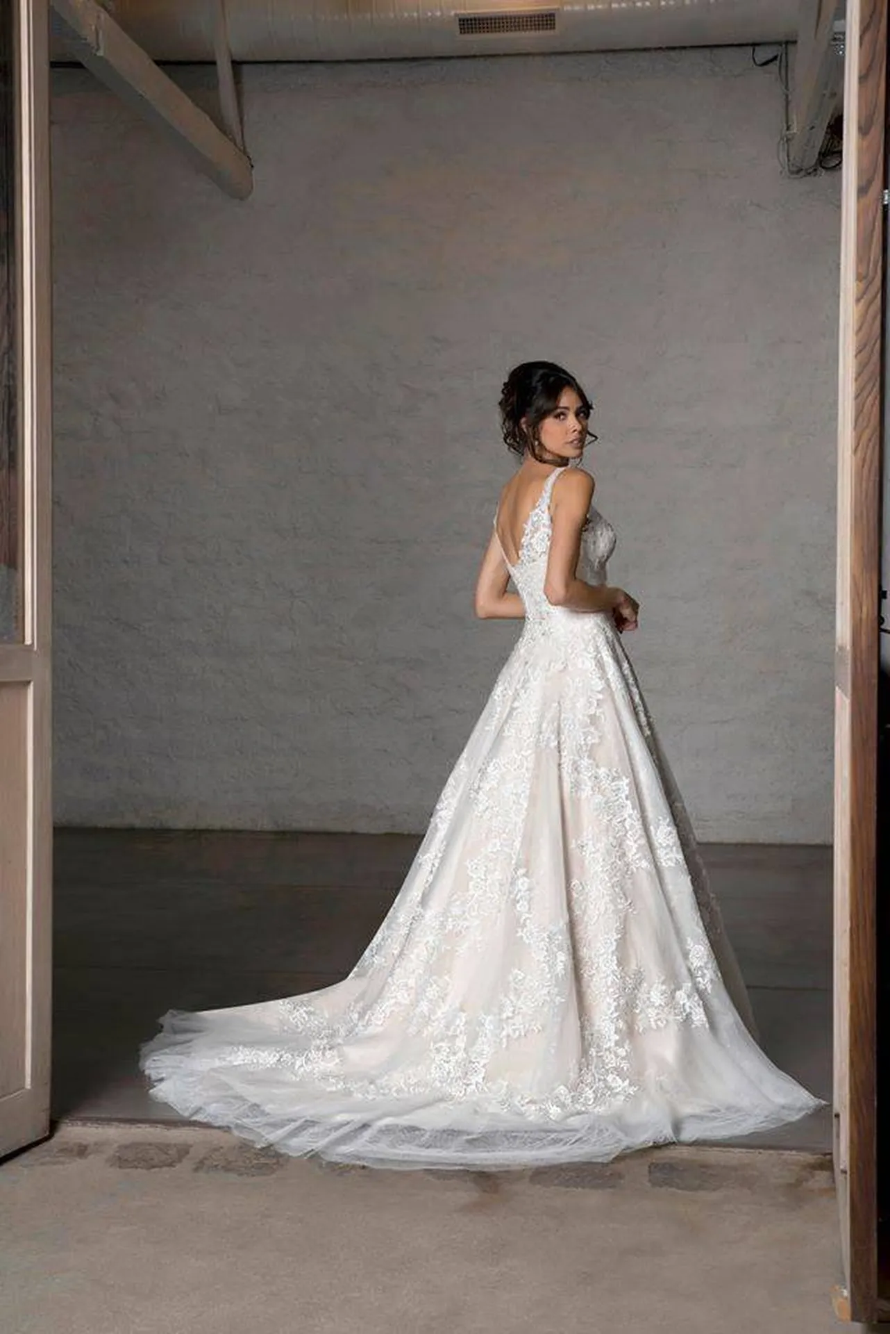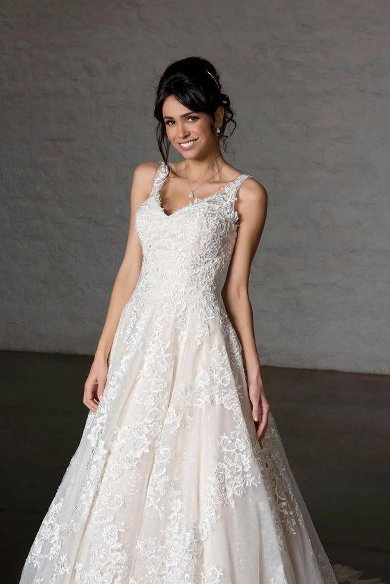 Le modèle Angélique est présenté en teinte nude sur les photos du site, mais il est également disponible en ivoire et en blanc, selon vos préférences. Pour un confort accru ou un volume supplémentaire, nous recommandons d’ajouter un jupon et, pour un effet encore plus majestueux, un voile long de 3 mètres ou plus.