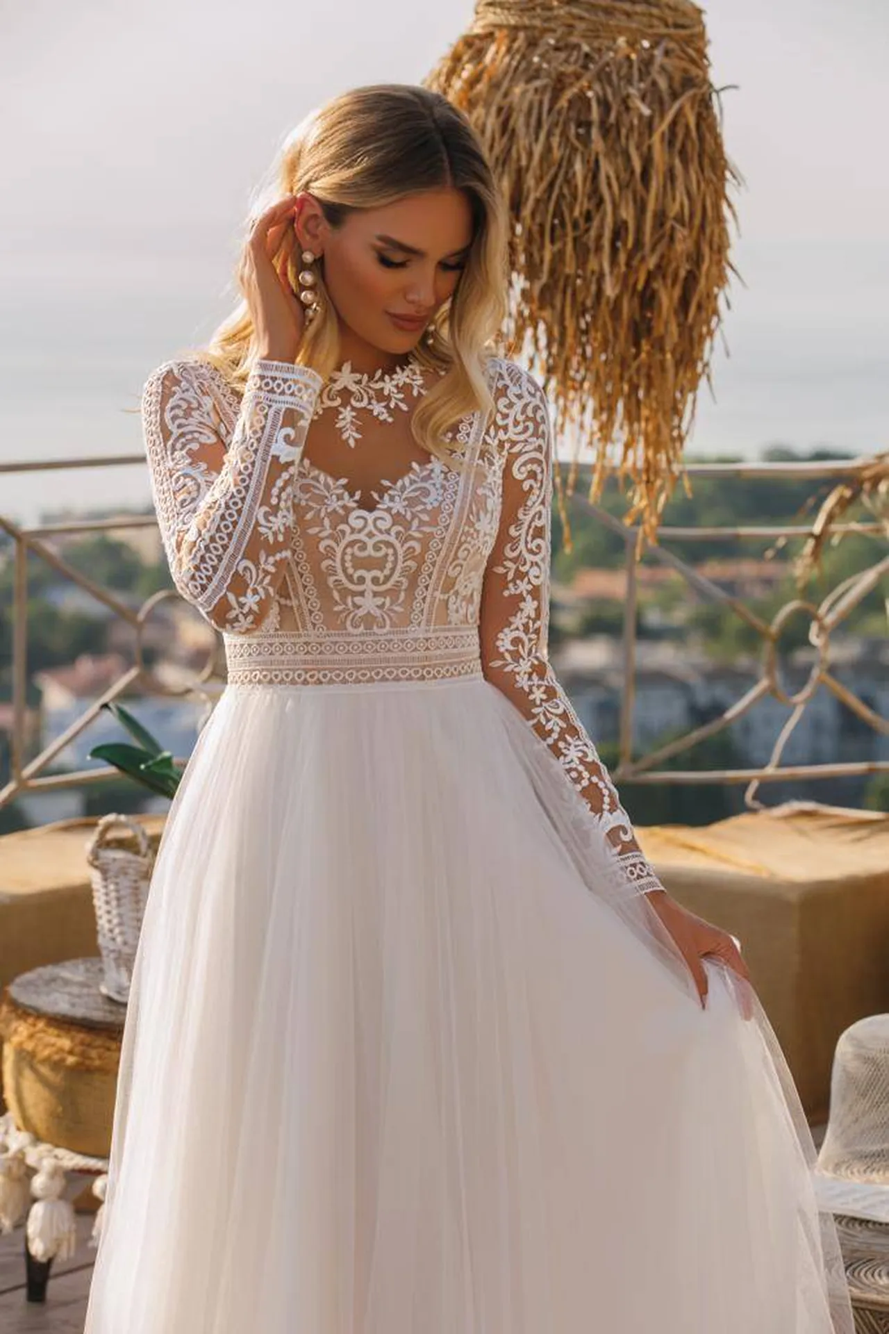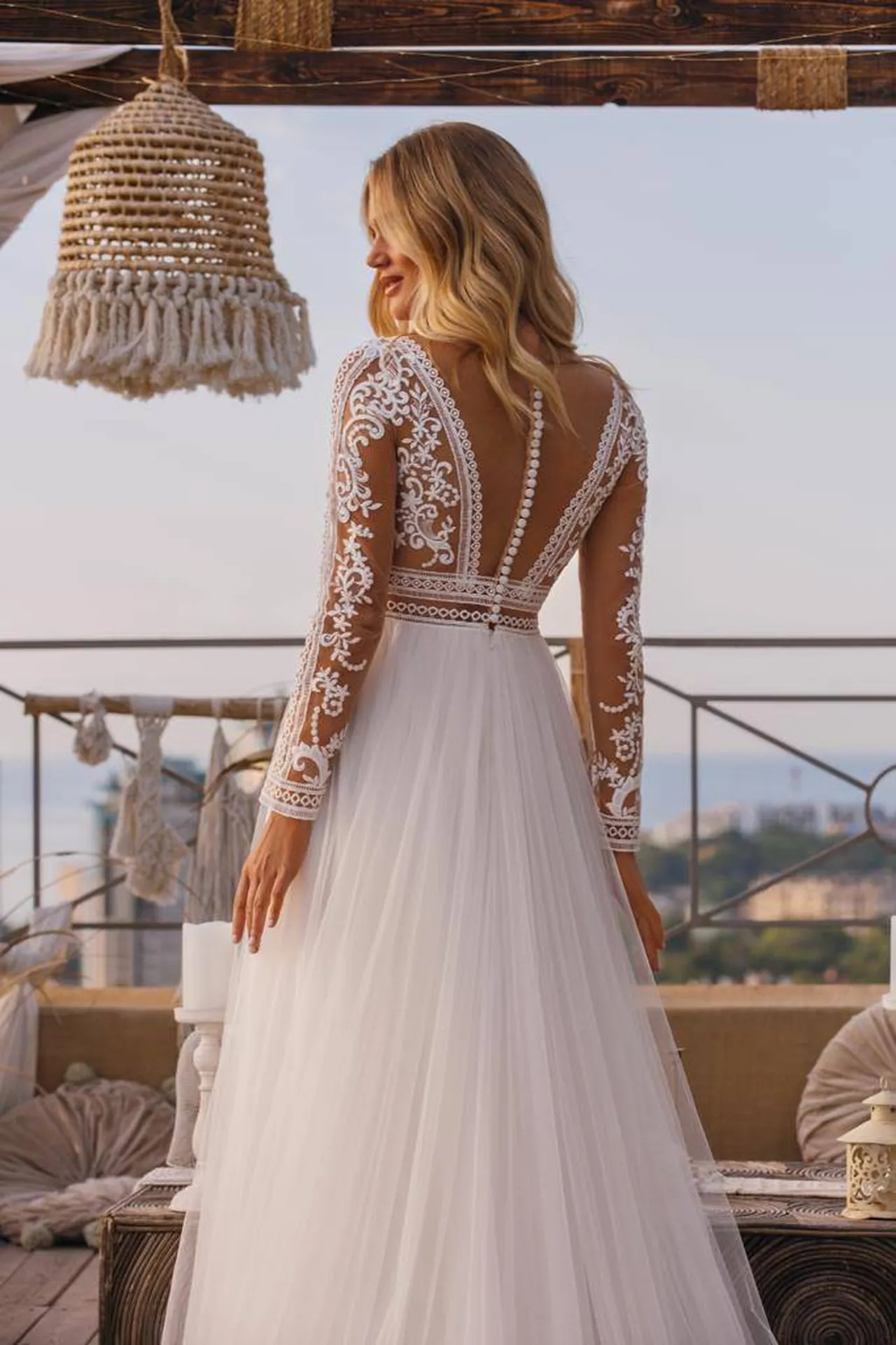 Les manches longues, également en dentelle fine, apportent une touche bohème chic, tandis que la taille, soigneusement travaillée, met en valeur la silhouette de la mariée avec des détails de dentelle subtils et raffinés.