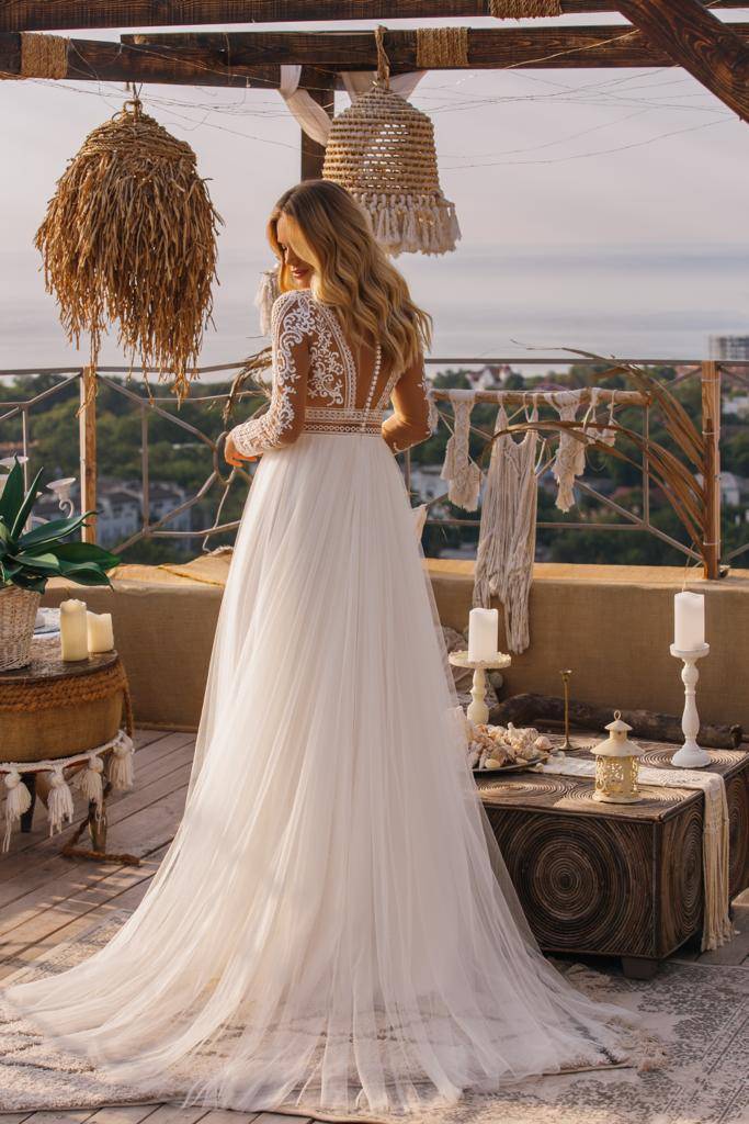 Les manches longues, également en dentelle fine, apportent une touche bohème chic, tandis que la taille, soigneusement travaillée, met en valeur la silhouette de la mariée avec des détails de dentelle subtils et raffinés.