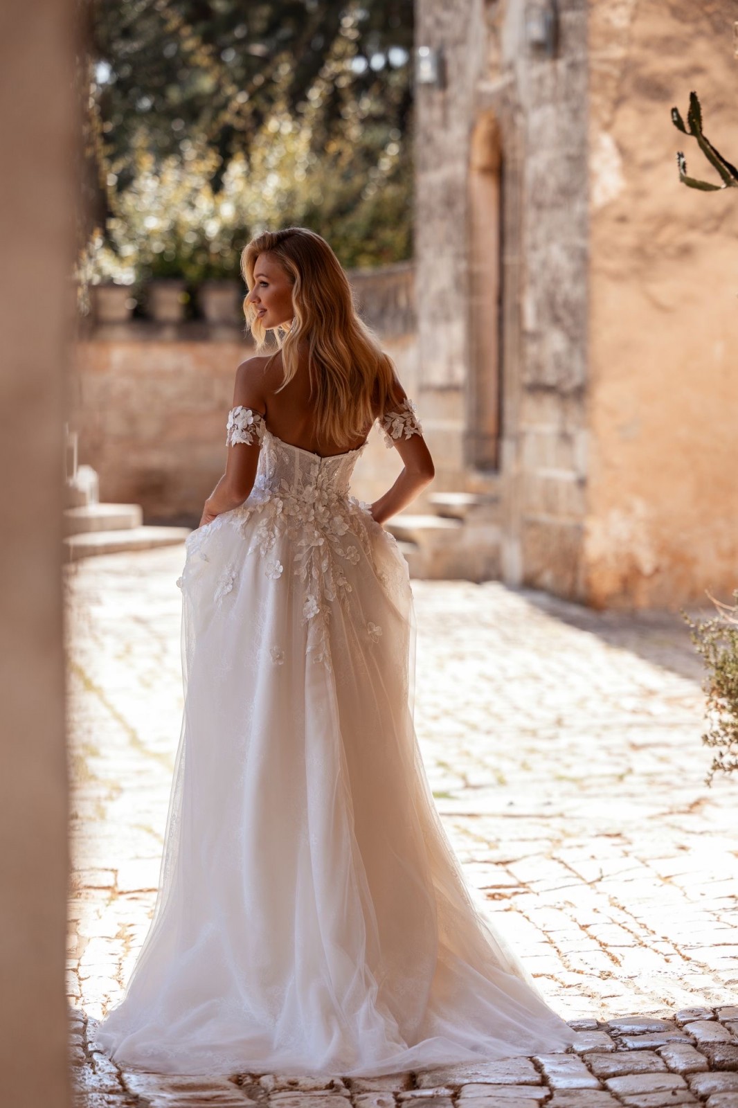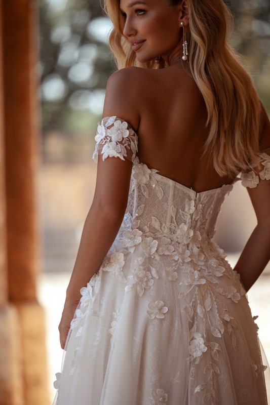 Le bustier de la robe Shaula est un chef-d’œuvre de précision, finement brodé de fleurs en 3D sur une délicate dentelle chantilly. Ajusté pour épouser parfaitement la silhouette, ce bustier met en valeur le buste avec raffinement et élégance. La jupe en tulle fin, évasée en forme trapèze, ajoute un mouvement gracieux à chaque pas, offrant une légèreté aérienne qui sublime la démarche de la mariée.