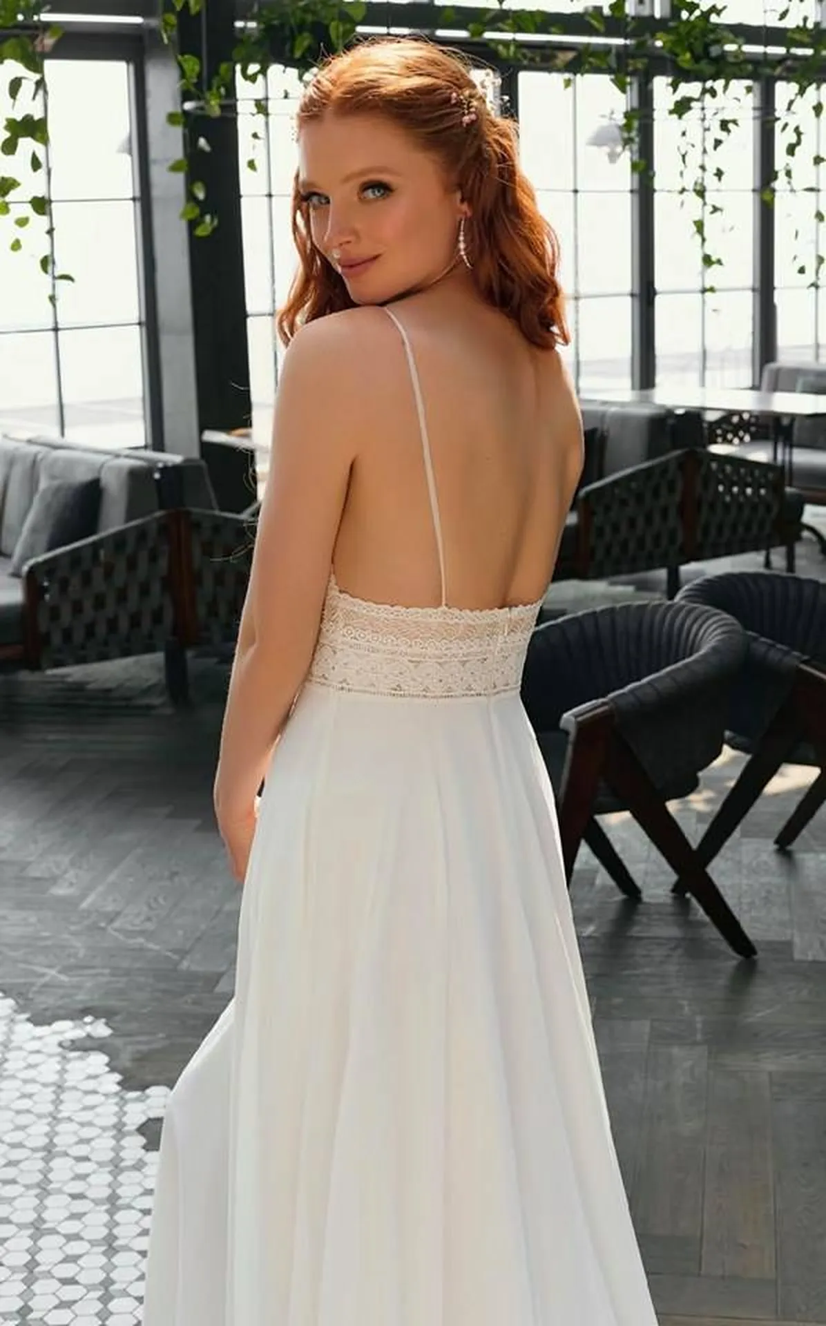 La ceinture large de la robe, qui se ferme dans le dos, crée un magnifique effet dos nu, accentuant la fluidité de la silhouette et la délicatesse du modèle. Ce détail très élégant donne un effet de légèreté, parfait pour une mariée bohème.
