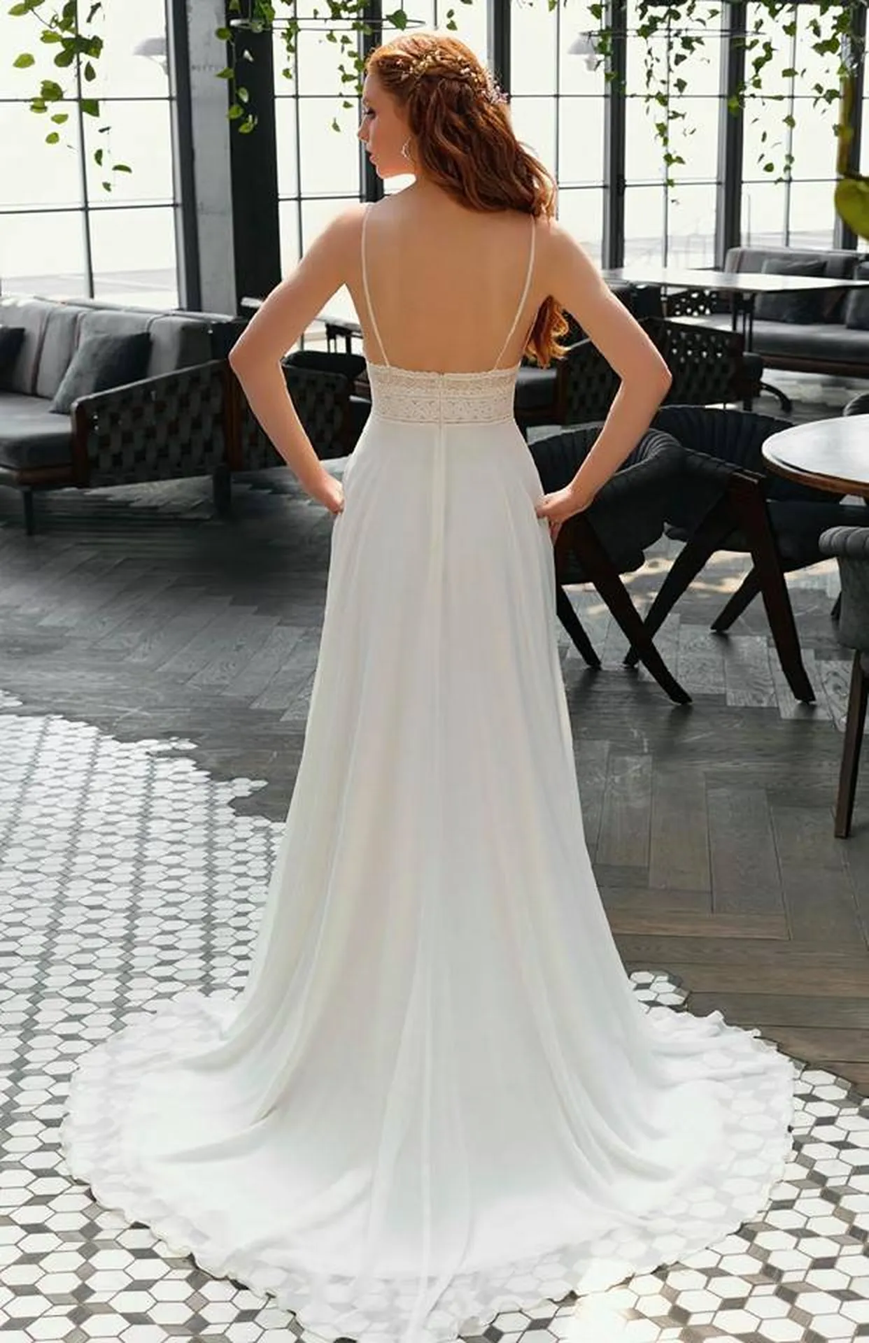 La jupe de la robe de mariée Ozara, réalisée en mousseline fluide, tombe en un mouvement gracieux, se terminant par une légère traîne qui apporte une touche supplémentaire de raffinement à ce modèle. Ce style épuré et aérien est idéal pour un mariage intime en plein air ou une cérémonie bohème chic.