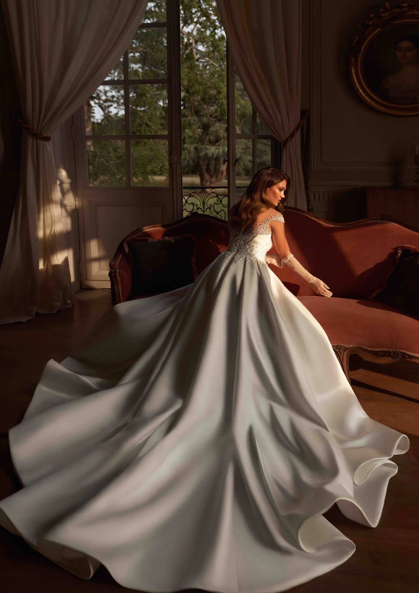 Pour parfaire le look, des gants hauts perlés viennent compléter cette tenue, ajoutant une touche de modernité et de sophistication ultime. La robe Porto est bien plus qu’une simple robe de mariée : c’est une déclaration de style, une pièce unique pour un jour inoubliable.