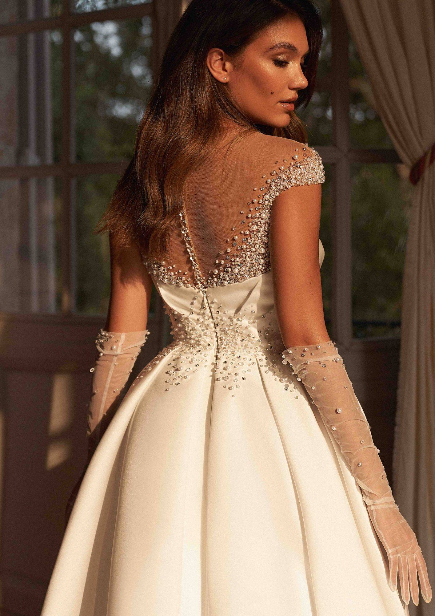 Pour parfaire le look, des gants hauts perlés viennent compléter cette tenue, ajoutant une touche de modernité et de sophistication ultime. La robe Porto est bien plus qu’une simple robe de mariée : c’est une déclaration de style, une pièce unique pour un jour inoubliable.