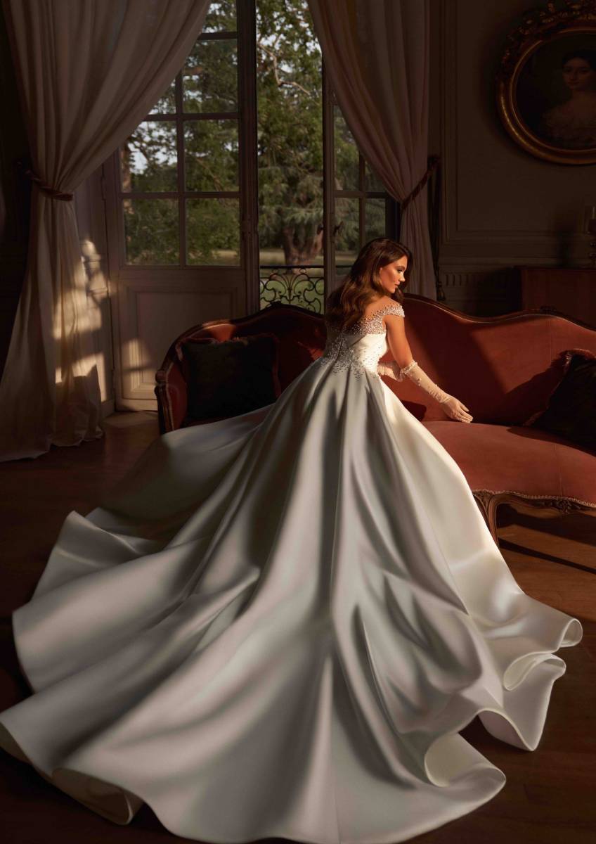 La jupe évasée, avec sa fente haute dévoilant la jambe, apporte une allure résolument moderne tout en préservant une élégance classique. Le dos de la robe est une véritable œuvre d’art, orné de perles disposées sur un tulle invisible, créant un effet de légèreté et de grâce. Très ajusté à la taille, il s’achève par une longue traîne majestueuse, idéale pour une entrée remarquée.