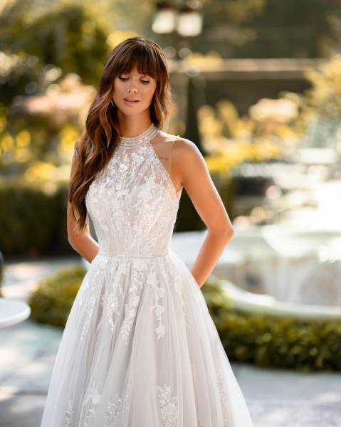 Il se ferme par une rangée de boutons transparents qui ajoute également une touche de charme à cette robe de mariée unique.