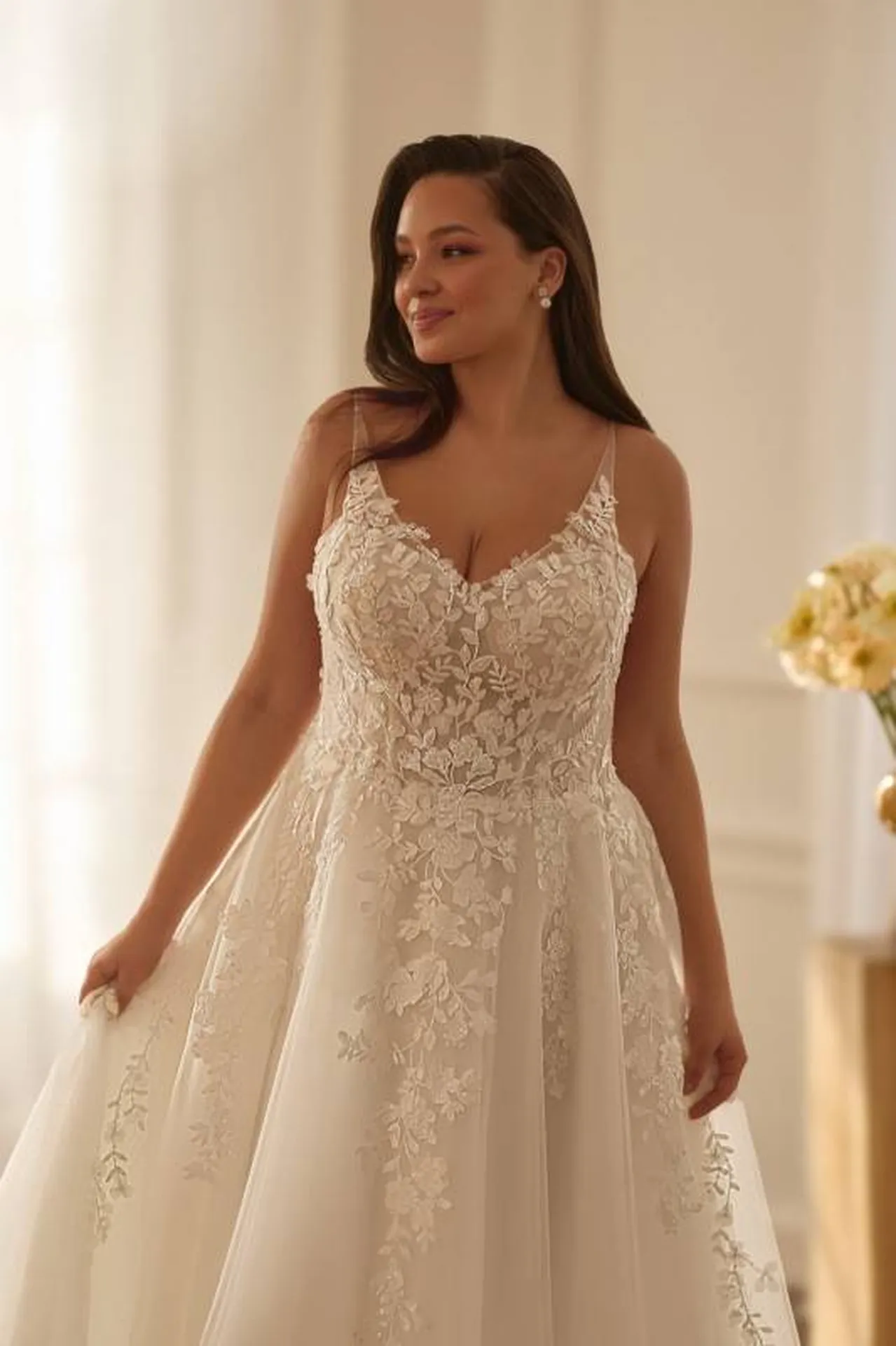 Le buste long, entièrement recouvert de dentelle, se fond harmonieusement avec la jupe volumineuse en tulle. La cascade de dentelle qui descend sur la jupe allonge et affine visuellement la silhouette, tout en offrant un confort incomparable pour votre grand jour.