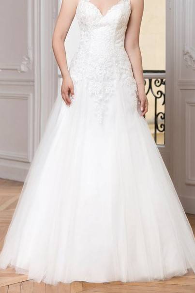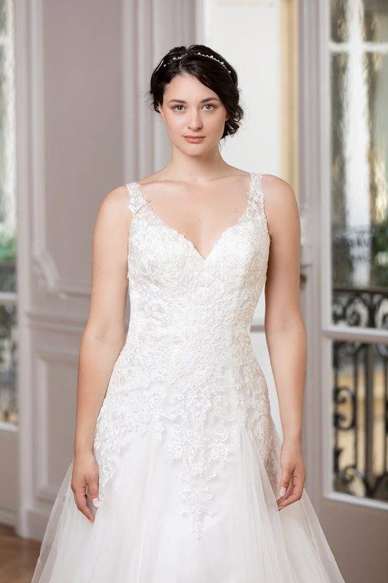 La robe 22401, disponible en blanc, ivoire ou nude, est un modèle princesse qui combine raffinement et modernité. Son décolleté en V flatte subtilement la poitrine, tandis que les bretelles, recouvertes de fine dentelle, apportent un détail romantique et délicat.