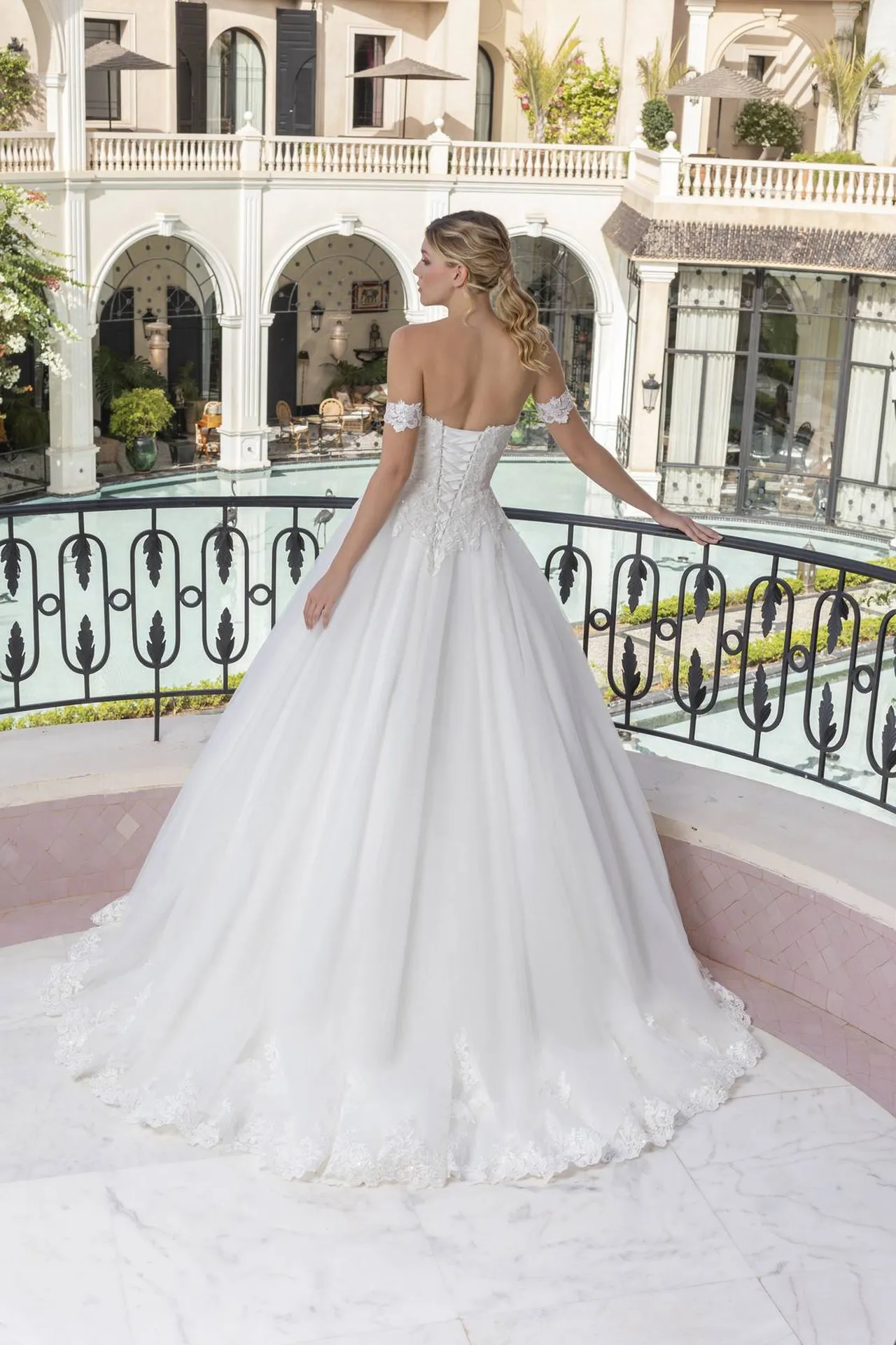 Le bas de la robe s’évase en une jupe volumineuse et légère, confectionnée en tulle de haute qualité. La traîne, soigneusement bordée de dentelle à motifs floraux, ajoute une touche de romantisme et d’élégance, parfaite pour une entrée spectaculaire. De petits brillants ornent la dentelle, apportant une lumière douce et scintillante à chaque mouvement.