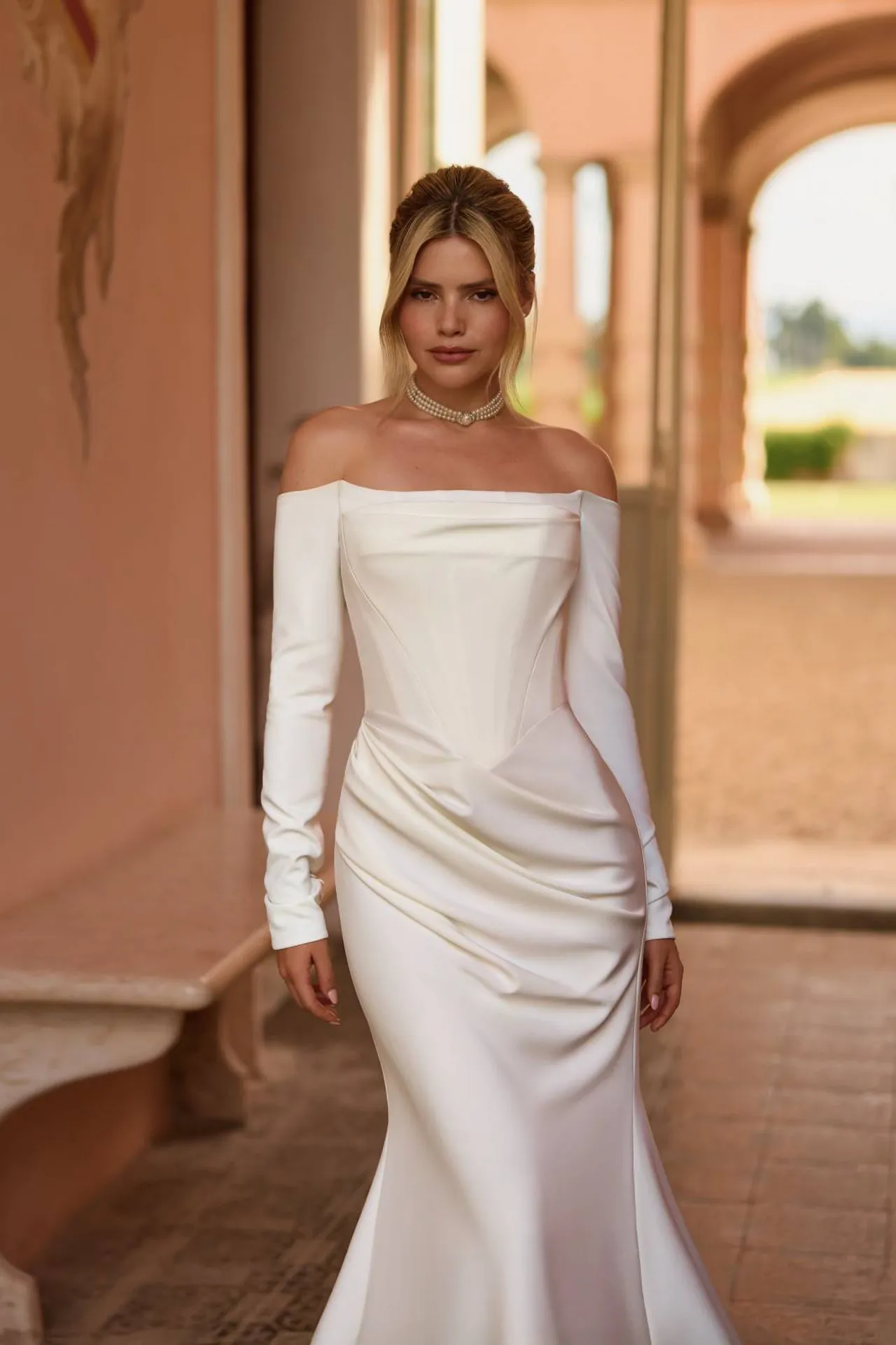 Le buste de la robe à un décollette en forme de coeur plongeant avec des manches longues recouverte d'une sublime dentelle fine.