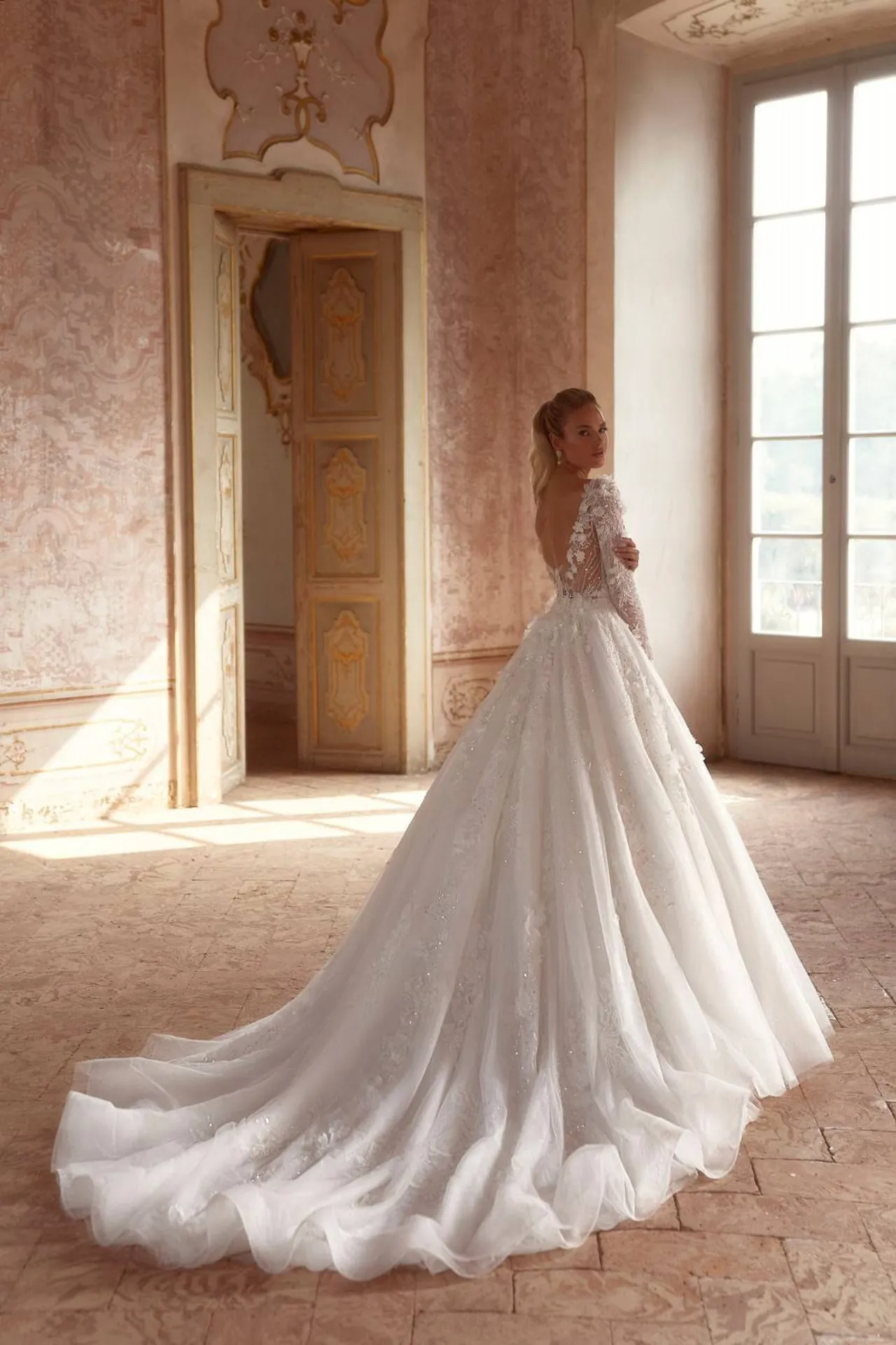 Les manches longues ballon de la robe de mariée princesse Démétrios 1188 sont également en fine dentelle.