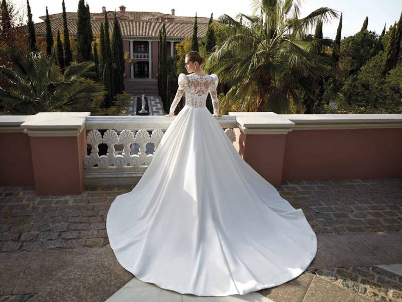 Robe de mariée princesse manches longues ballon et bas en mikado nouvelle collection Démétrios 2024 à Marseille
