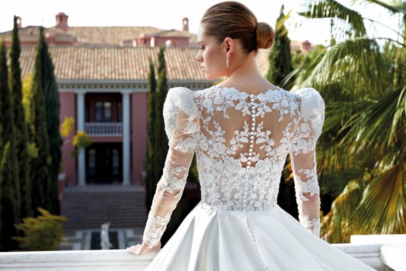 Les manches longues ballon de la robe de mariée princesse Démétrios 1188 sont également en fine dentelle.