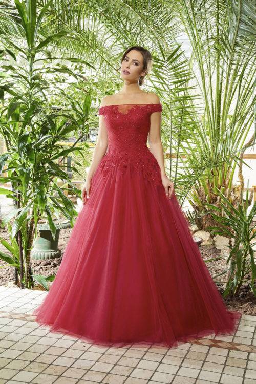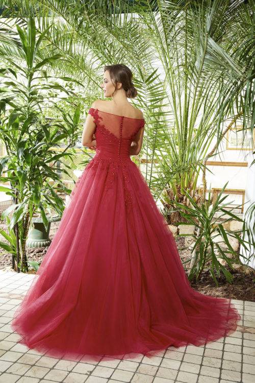 Ce modèle, véritable bijou de raffinement, incarne l’élégance et la féminité grâce à son encolure bateau. Cette dernière est délicatement recouverte de tulle brodé de fine dentelle, offrant un design subtil et romantique qui couvre élégamment le haut des bras et le décolleté.