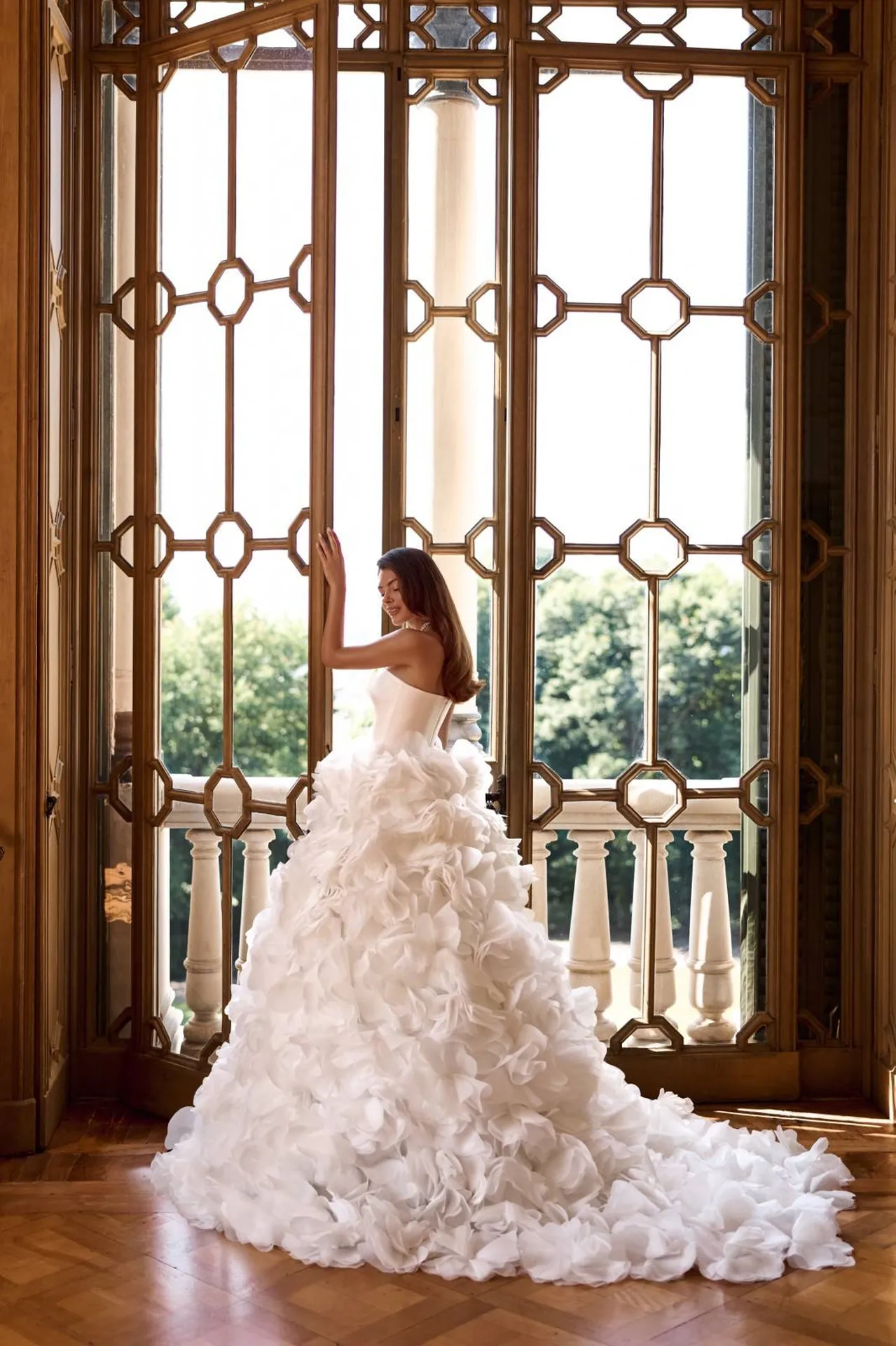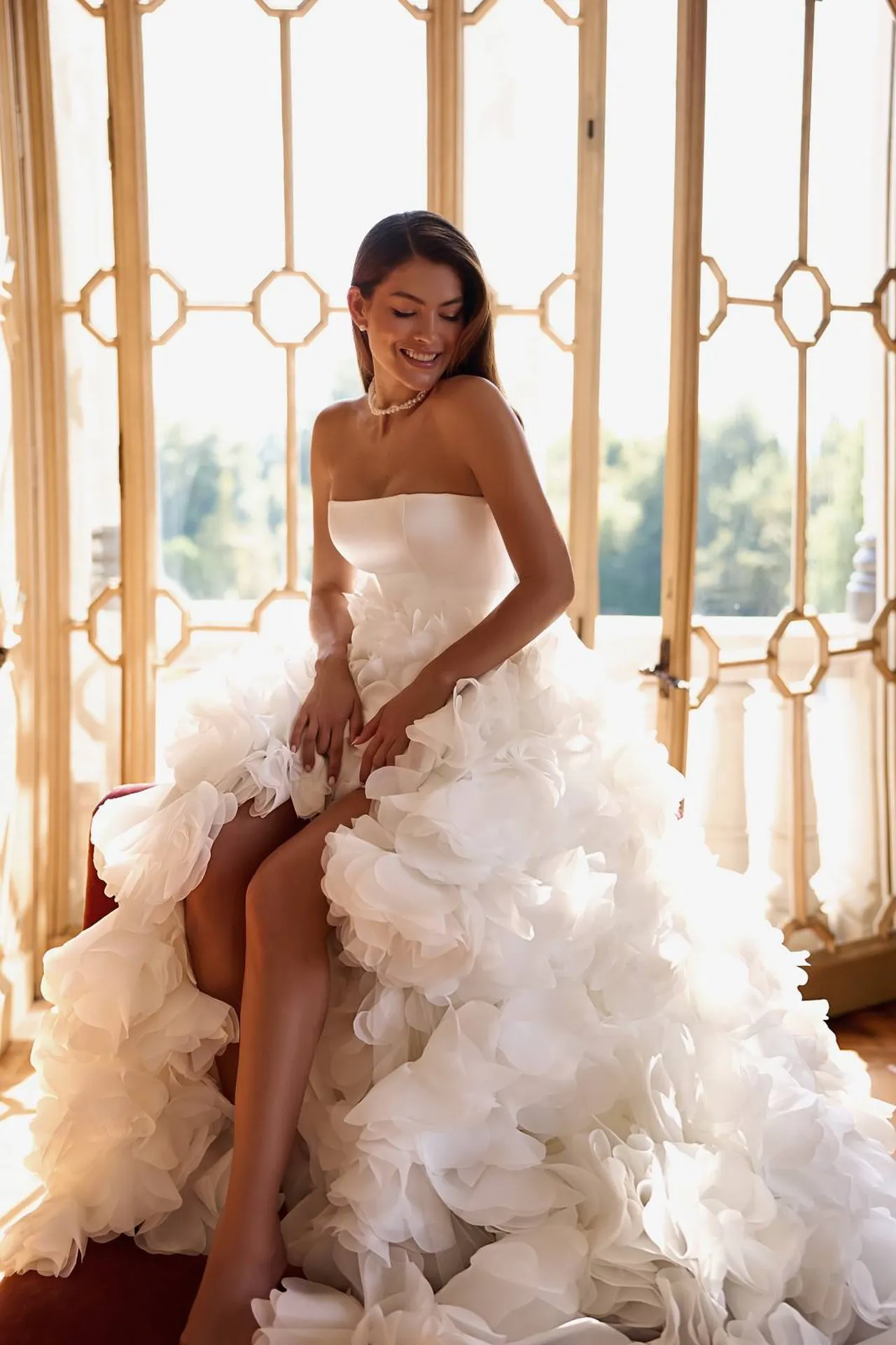 Le bas de la robe est asymétrique avec une longue traîne cascade de tulle